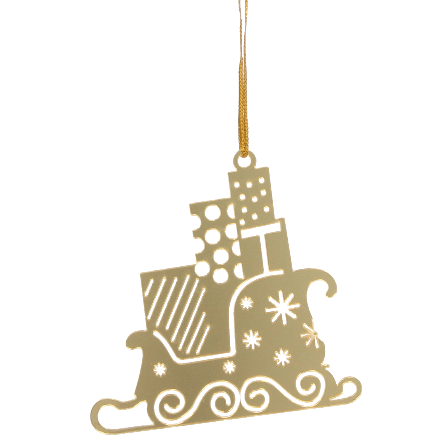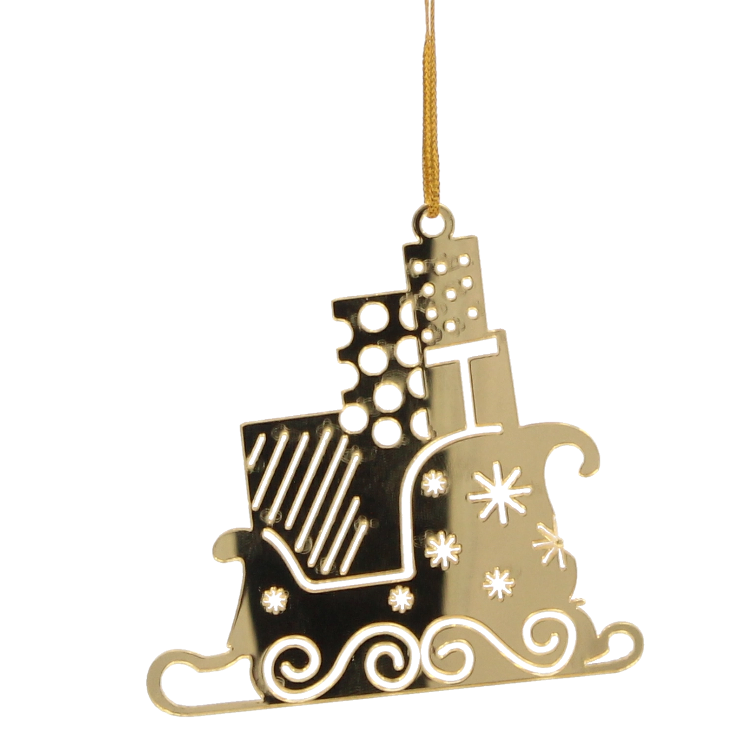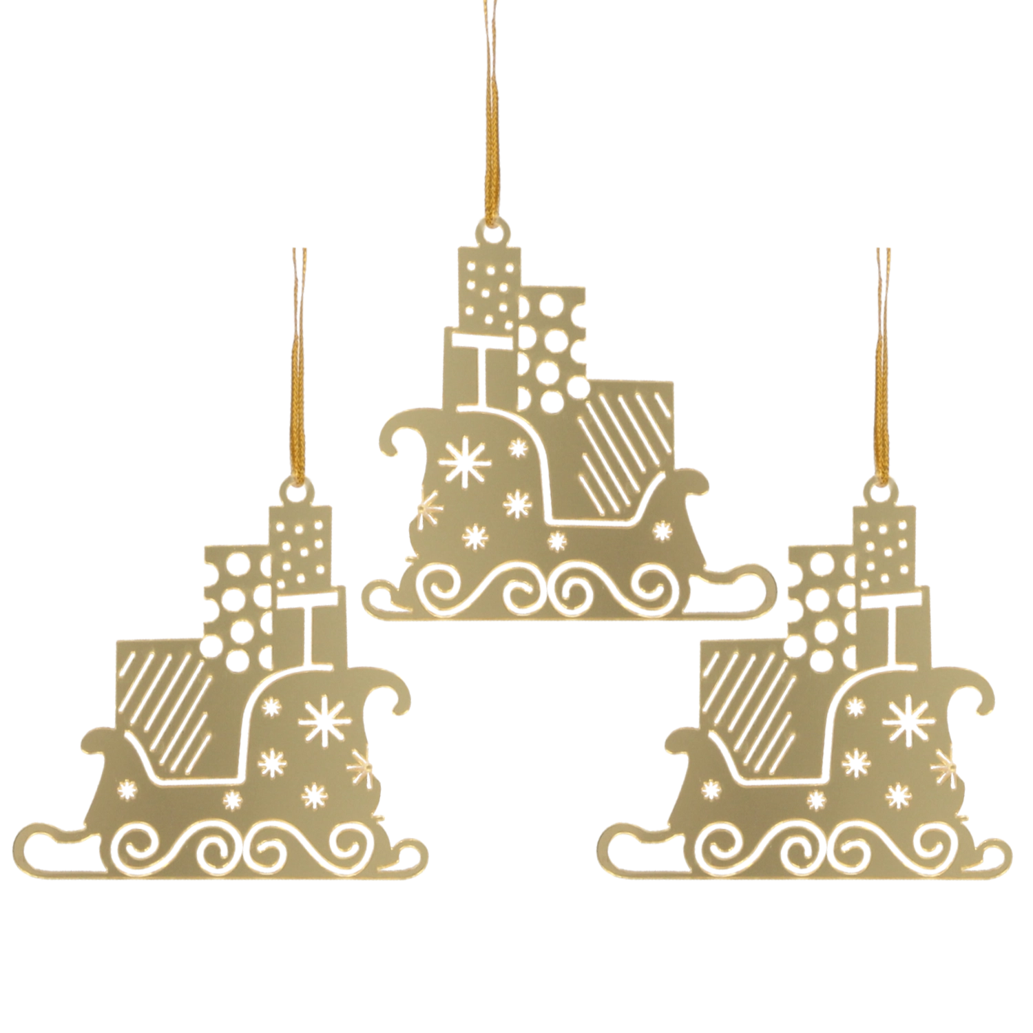 Očarajte svoje bližnje s stilsko dekoracijo. Set treh zlatih okraskov v obliki Božičkovih sani prinaša v notranjost praznični blišč in eleganco. Lahek material olajša rokovanje, natančna izdelava pa zagotavlja dolgo življenjsko dobo, da jih lahko uživate vsako sezono.