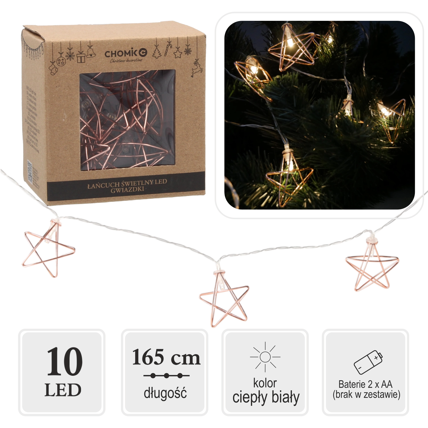 Eleganten svetlobni niz z zvezdicami ustvari prijetno in domačno vzdušje v dnevni sobi, spalnici ali otroški sobi. Topla bela svetloba deluje pomirjujoče in odlično poudari praznične kot tudi celoletne dekoracije.