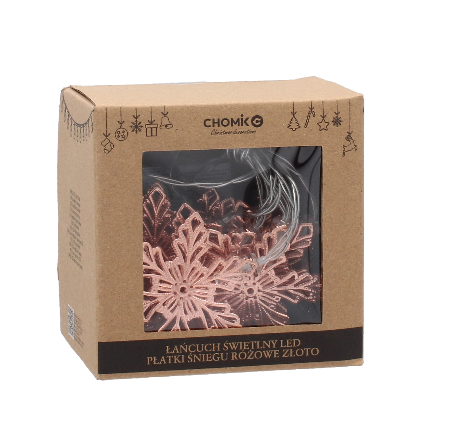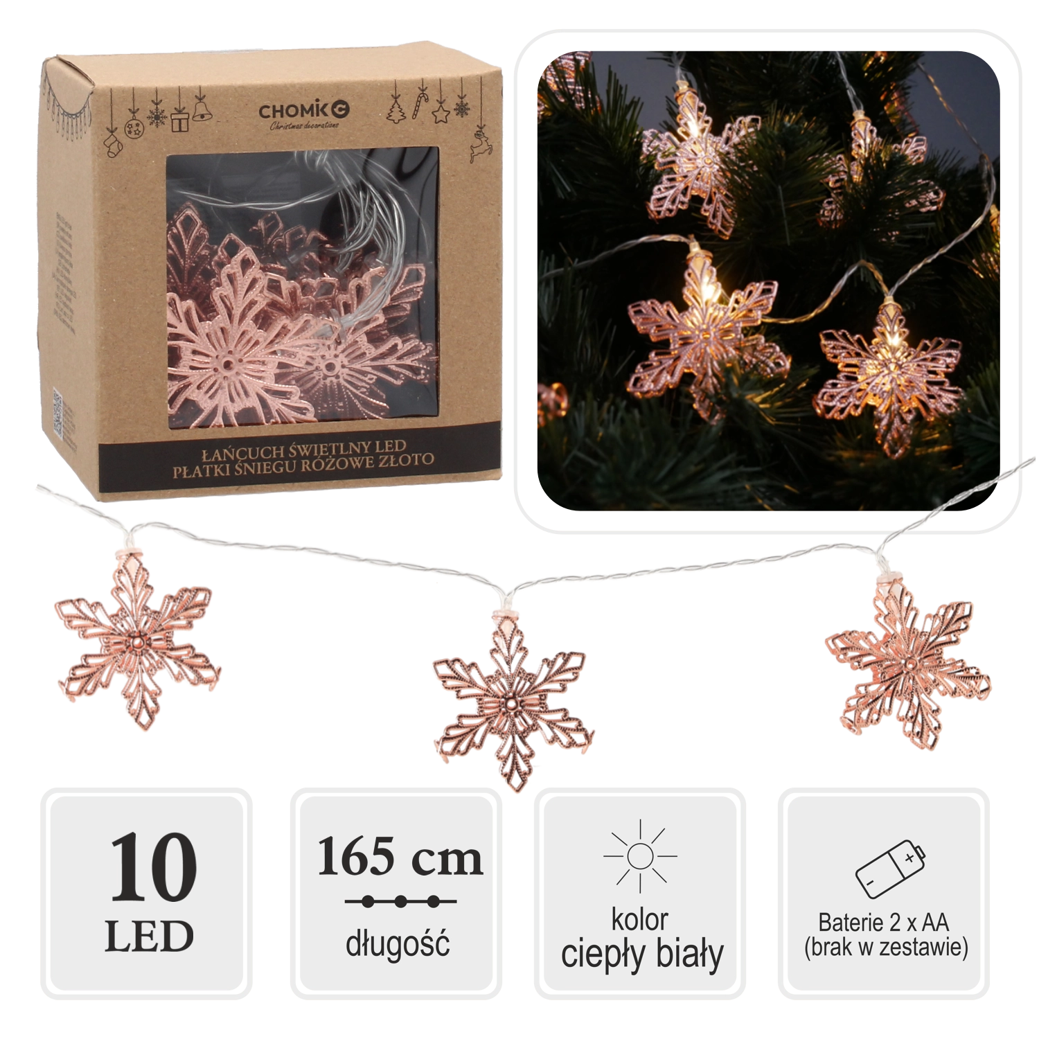 Ustvarite zimsko vzdušje z elegantnim LED svetlobnim nizom v obliki snežink v odtenku rožnatega zlata. 10 toplih belih LED pričara prijetno, praznično razpoloženje, medtem ko baterijsko napajanje 2× AA zagotavlja maksimalno svobodo postavitve brez kablov.