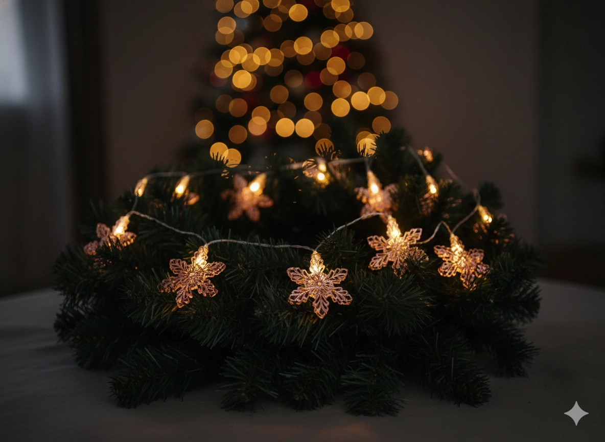 Očarajte notranjost z nežnim leskom snežink v rožnatem zlatu. Ta dekorativni niz z 10 LED prinaša prijetno toplo belo svetlobo, ki se poda v dnevno sobo, spalnico in na praznično mizo. Zahvaljujoč baterijskemu napajanju ga zlahka postavite kamor koli – brez vtičnice in brez vidnih kablov.