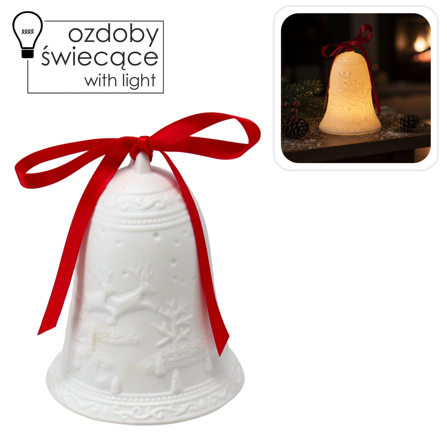Ta keramični božični zvonček očara z dovršenim reliefom in toplo LED svetlobo, ki vašemu domu doda prijetno, praznično razpoloženje. Zahvaljujoč vgrajeni LED osvetlitvi je varen in energijsko varčen – idealen za dolge zimske večere.