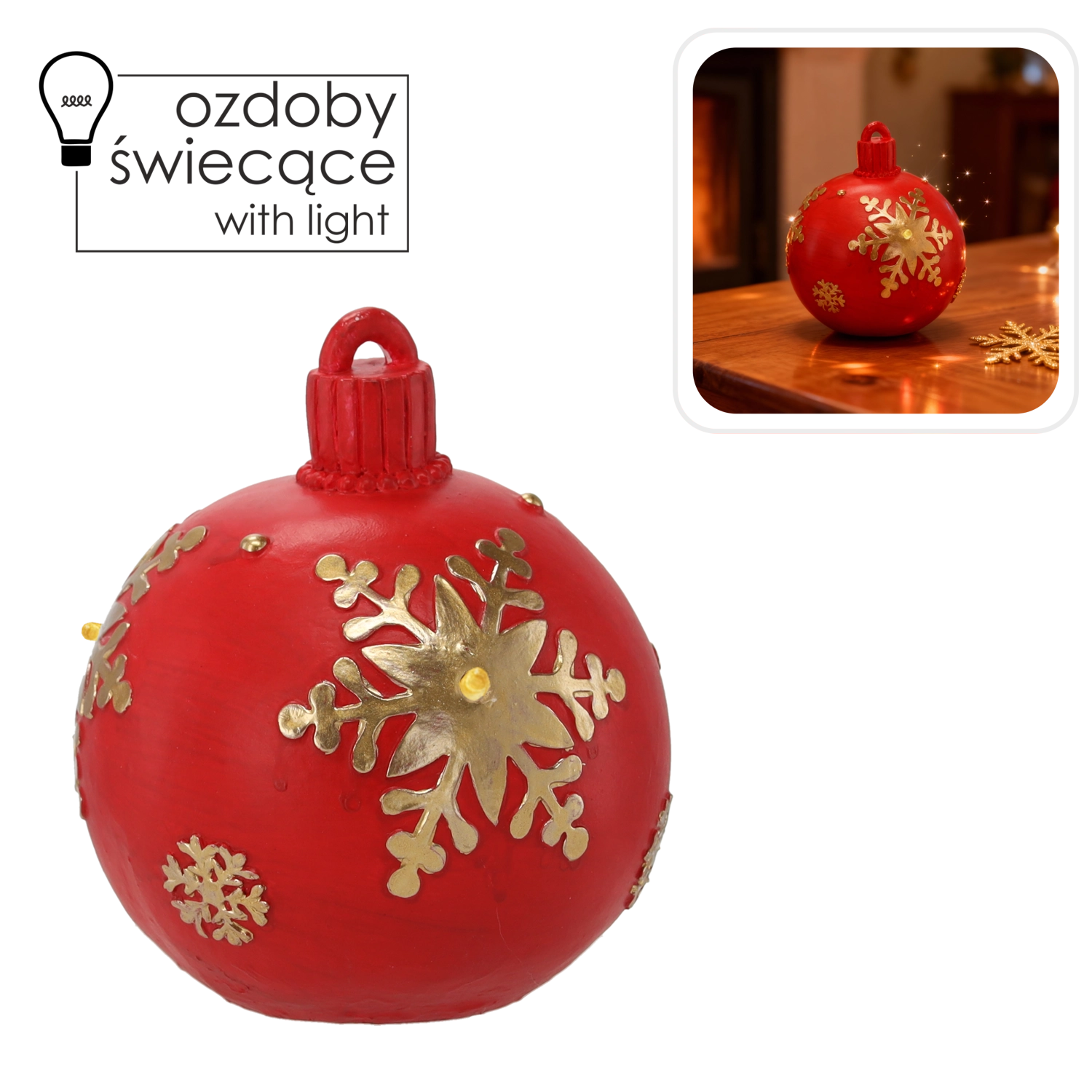 Ta elegantna rdeča bunka z vgrajenimi LED diodami ustvari čarobno, mehko svetlobo, ki poudari zlate detajle in poudari božično domačnost. Zahvaljujoč kakovostni izdelavi in brezčasnemu dizajnu se zlahka kombinira z drugimi dekoracijami.