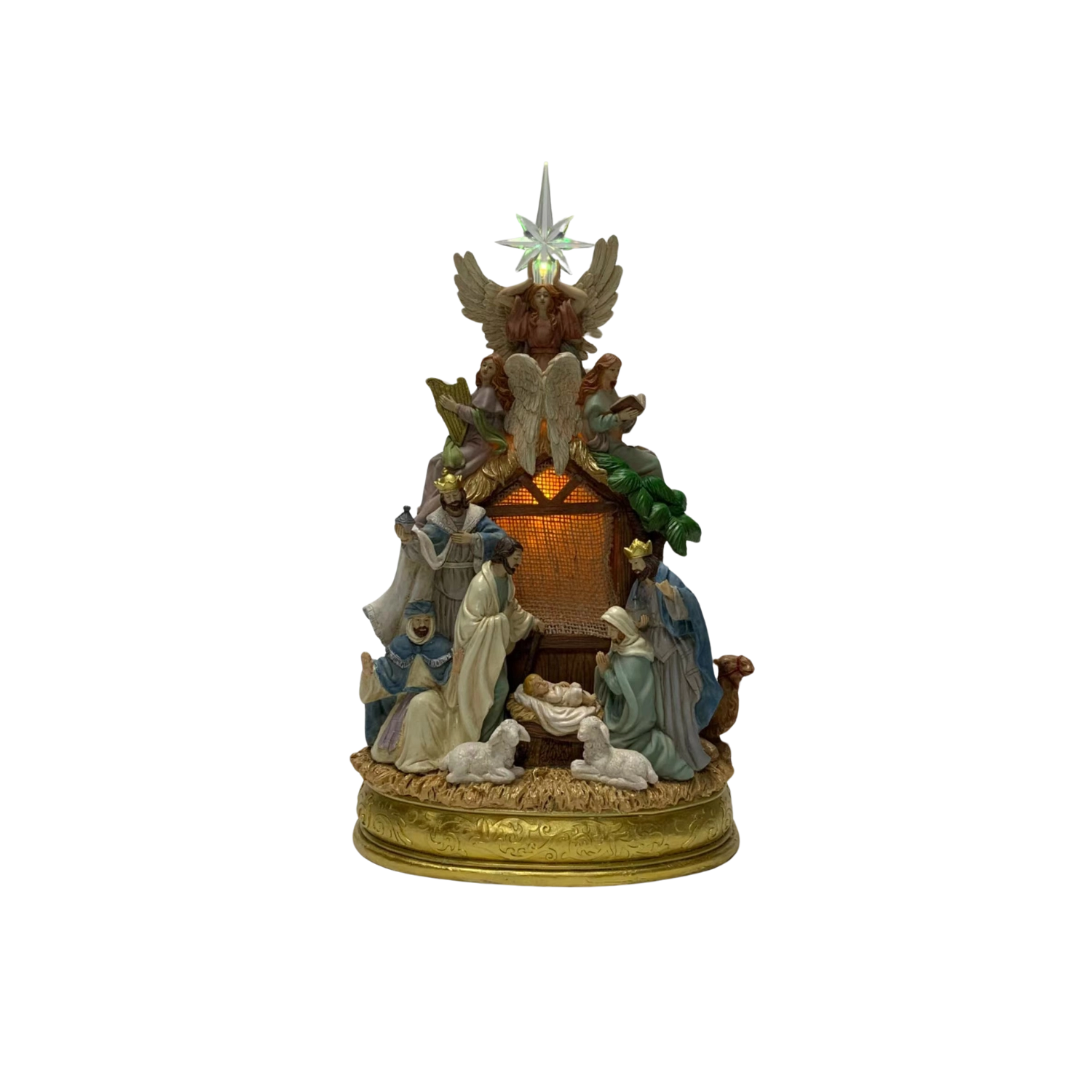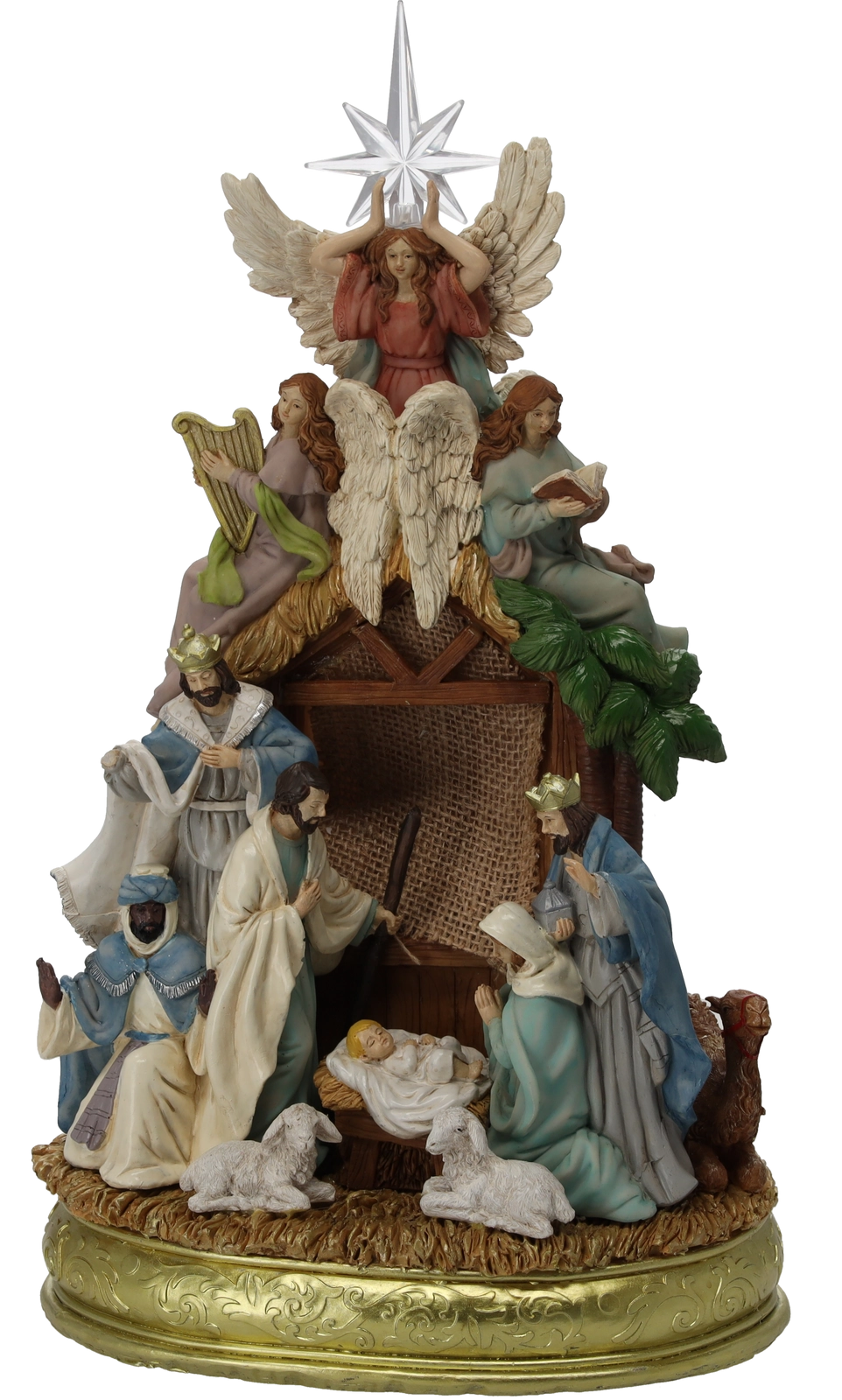 Ta dekorativna betlehemska scena iz smole navduši z dovršenimi figurami Svete družine, angelov, pastirjev in Treh kraljev. Vgrajena LED osvetlitev prijetno toplo osvetli hlevček, medtem ko betlehemska zvezda barvno pulzira in poudari praznično vzdušje.