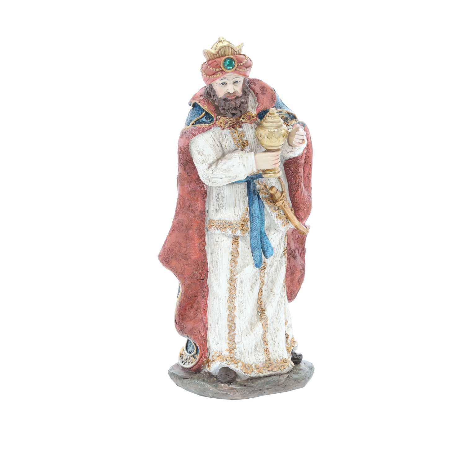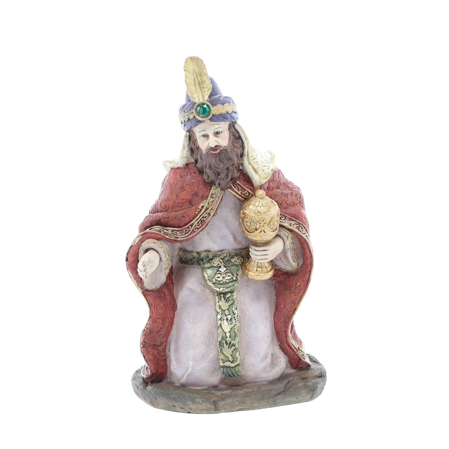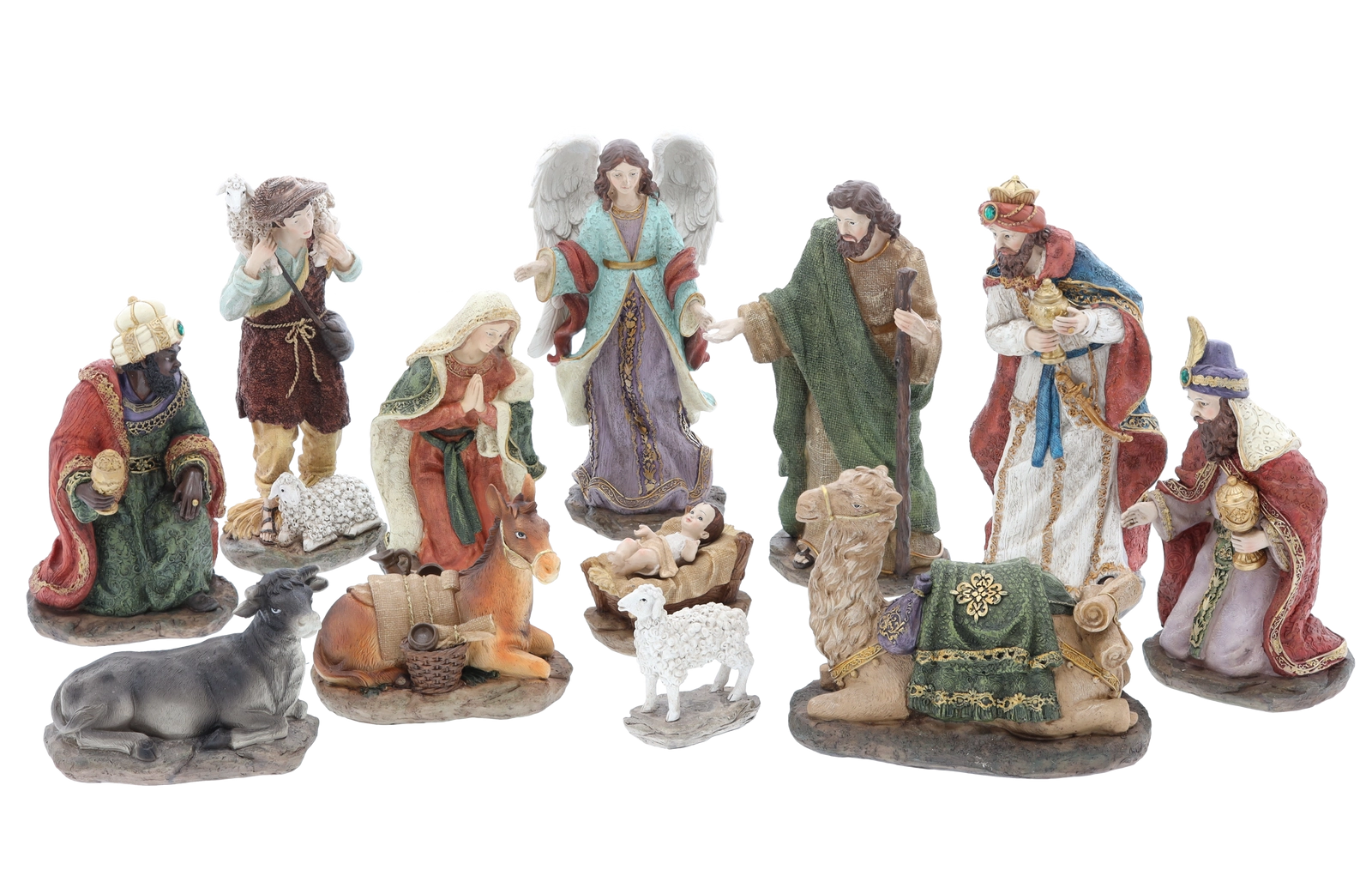 Ta popoln set jasličnih likov vključuje Sveto družino, tri kralje, angela, pastirja in živali (vola, ovco, oslička in kamelo) – vse v usklajenih barvah in z bogato teksturo. Polirezin zagotavlja dolgo življenjsko dobo, barvno obstojnost in eleganten videz.