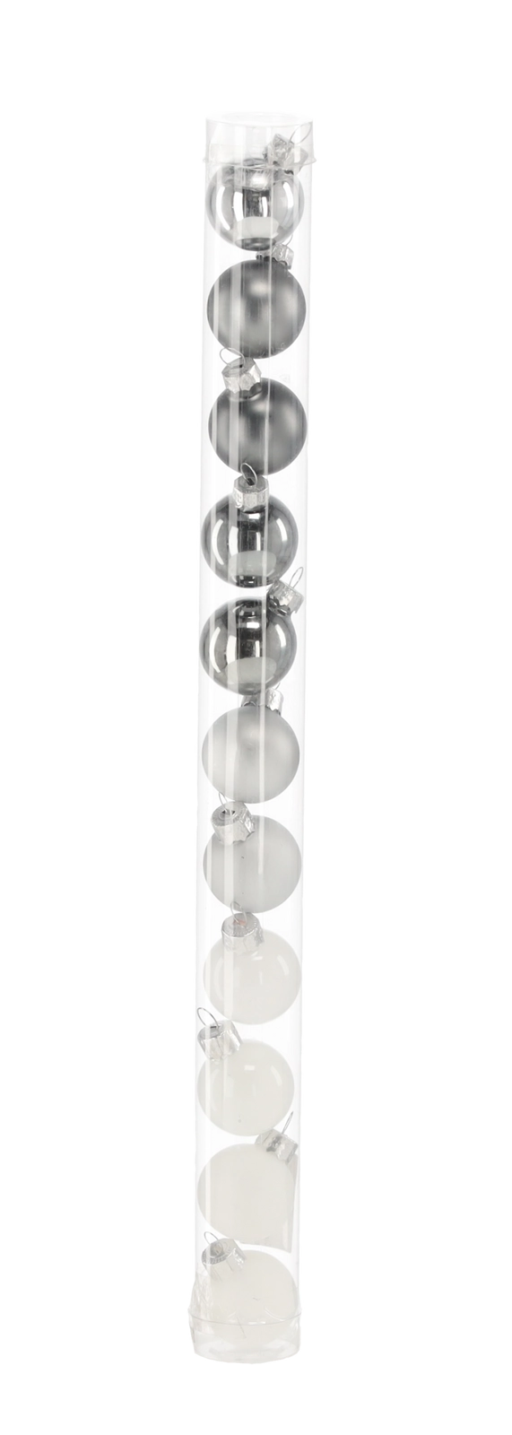 Eleganten set 11 steklenih okraskov s premerom 3 cm v kombinaciji bele in srebrne barve doda drevesu moderen, sofisticiran videz. Mešanica sijajnih, mat in prozornih površin čudovito odbija svetlobo in ustvarja nežen praznični lesk. Praktična cevasta škatla olajša shranjevanje in podarjanje.