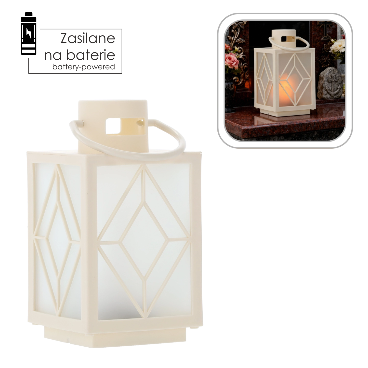Z napajanjem na baterije je lampijon popolnoma prenosljiv – zlahka ga postavite na polico, teraso ali nagrobni spomenik. Trden ročaj omogoča obešanje in hitro spremembo postavitve po potrebi.
