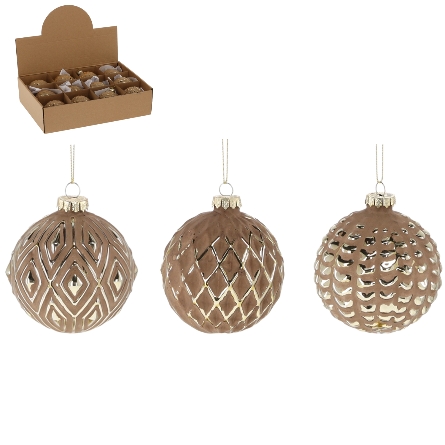 Elegantne steklene božične krogle s premerom 8 cm v rjavi barvi z zlatimi ornamenti dodajo vašemu okrasju razkošen in prefinjen videz. Kombinacija mat površine in sijočih detajlov ustvarja izrazit kontrast, ki na drevesu čudovito izstopa. Set vsebuje 12 kosov z različnimi vzorci, ki jih zlahka uskladite z ostalimi dekoracijami ter ustvarite harmonično in prijetno vzdušje med božičem.