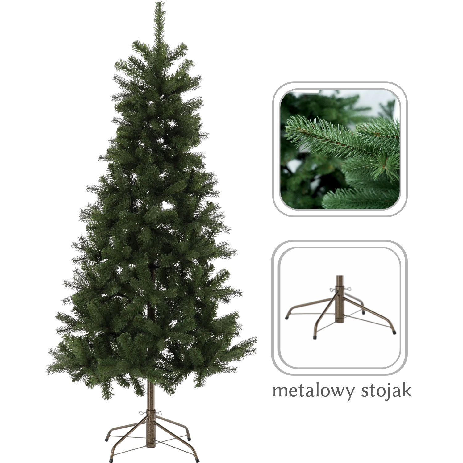 Elegantno umetno božično drevo višine 210 cm je brezčasna dekoracija z gostimi PVC vejami in stabilnim kovinskim stojalom. Zahvaljujoč intenzivnemu zelenemu odtenku deluje naravno, je odporno proti bledenju in ponuja preprosto montažo in demontažo. Uživajte v realističnem videzu, dolgi življenjski dobi in varnem postavljanju tudi pri bogatem okraševanju.