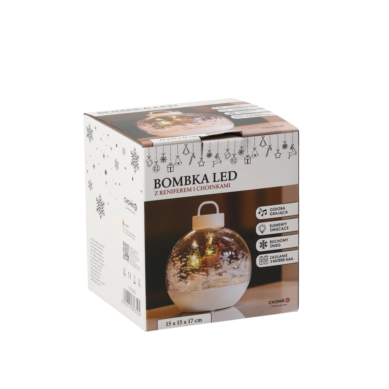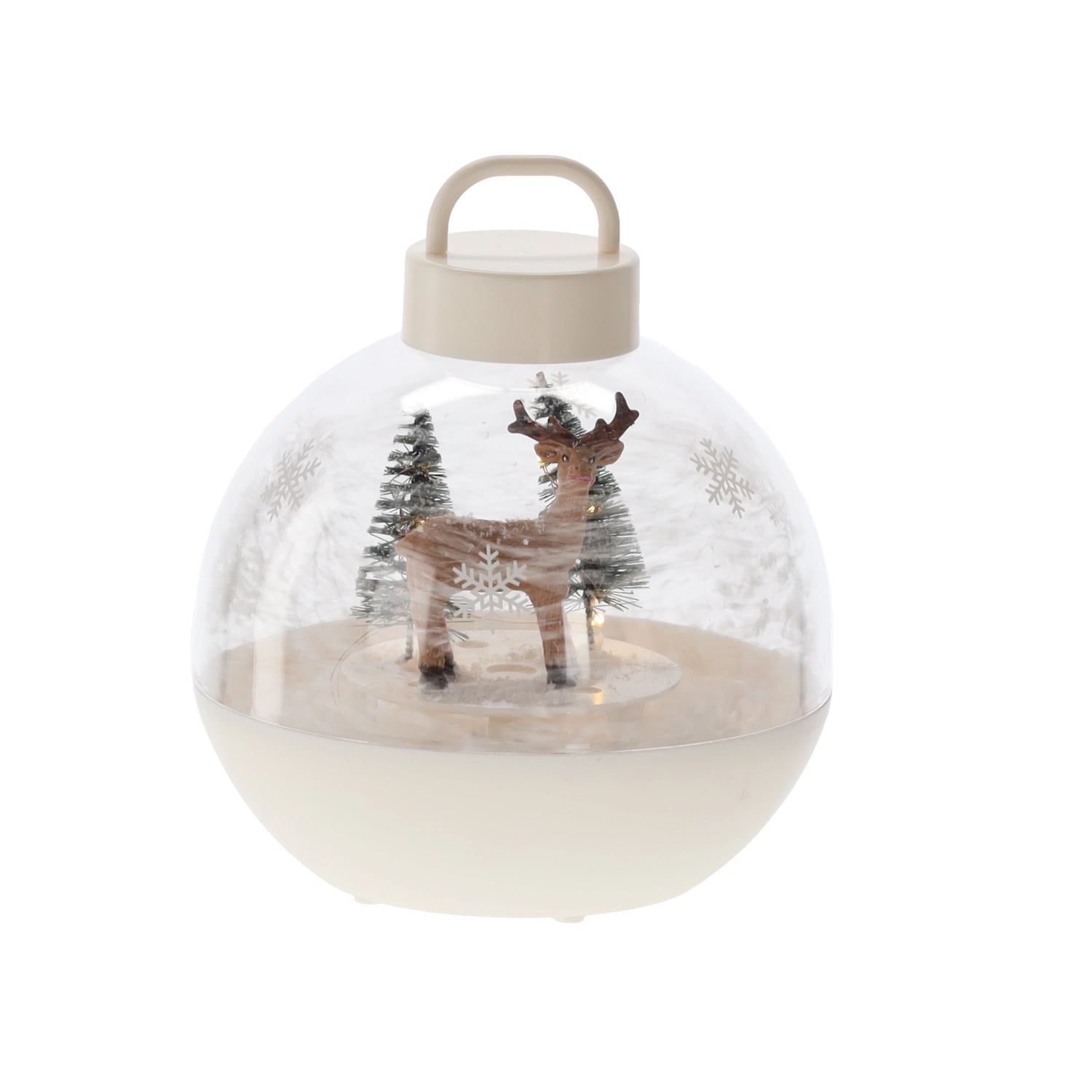 V dom vnesite praznično vzdušje z izstopajočo dekoracijo v obliki prozorne krogle s kremnim/belim podstavkom. V notranjosti je skrbno izdelan jelen in zimska drevesca, ki pod toplo belo LED svetlobo ustvarjajo prijetno sceno. Okrasek ponuja tudi glasbeni mehanizem z 8 pesmimi ter učinek padajočega snega.