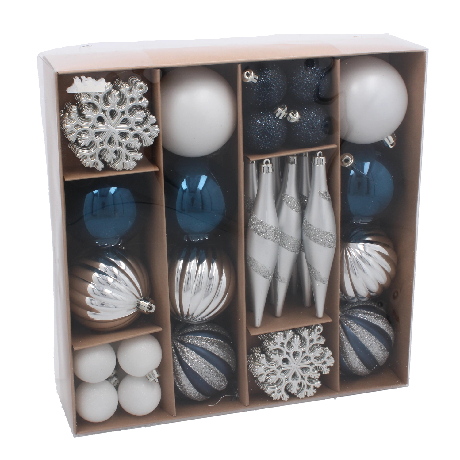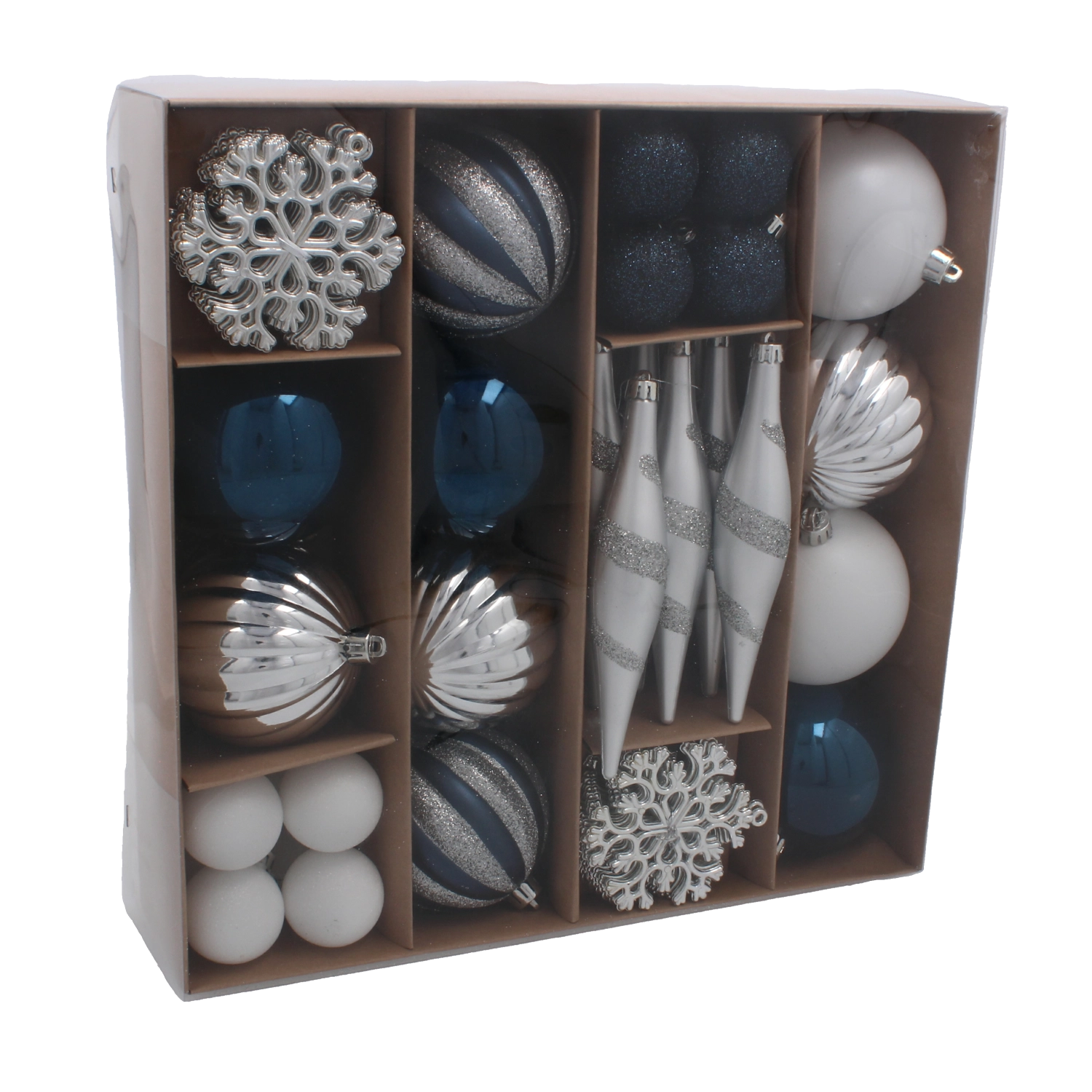 Eleganten komplet 50 božičnih okraskov v odtenkih mornarsko modre in srebrne doda vaši božični dekoraciji sodoben pridih in harmonijo. Okraski so iz nelomljive plastike, varni za gospodinjstva z otroki in hišnimi ljubljenčki, ter se zaradi lahke zasnove preprosto obešajo na majhna in velika drevesca. Različne oblike – od klasičnih krogel do storžev – omogočajo ustvariti slogovno usklajeno dekoracijo. Dobavljeno v darilni škatli, primerno tudi kot lepo darilo.