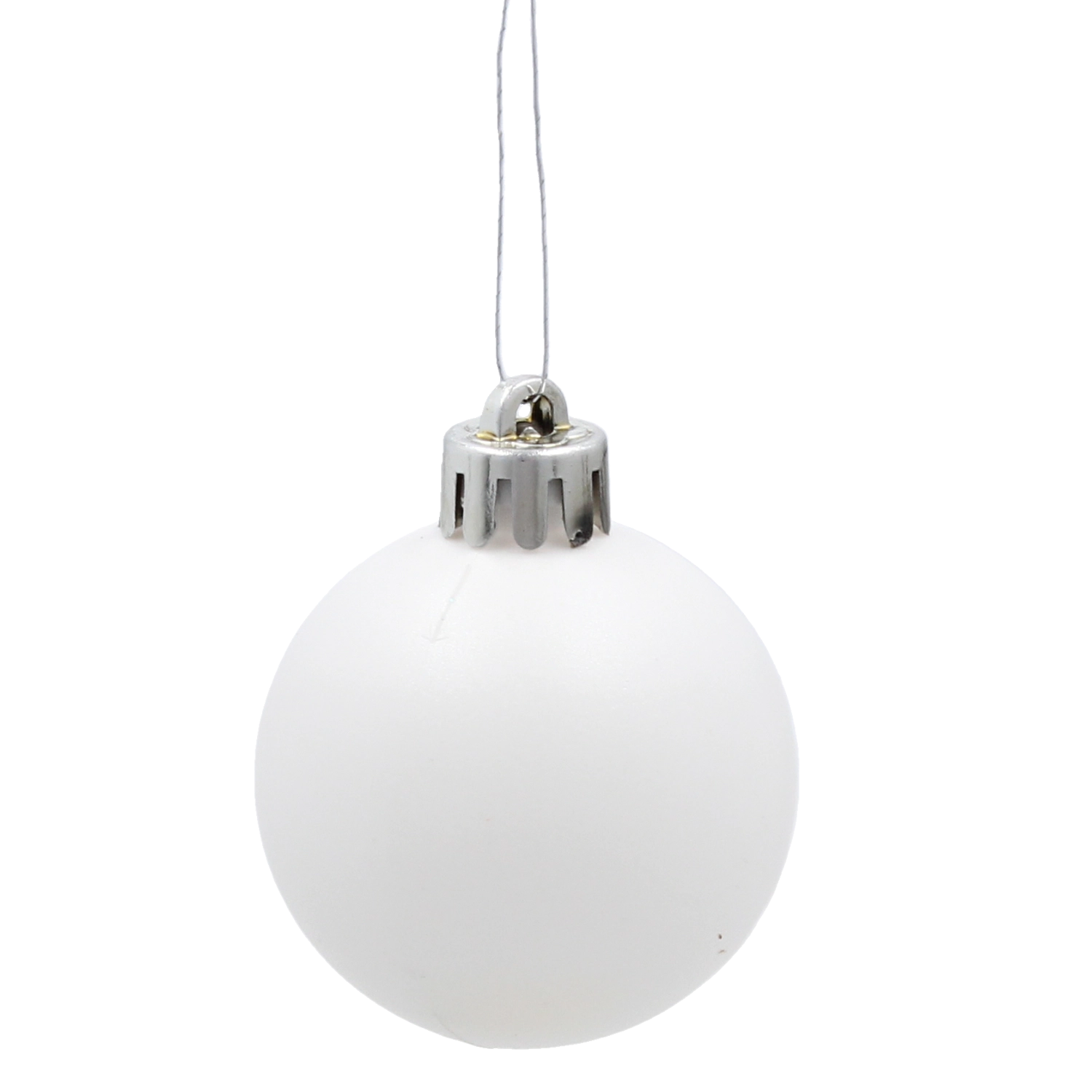 Eleganten set 18 belih božičnih okraskov s premerom 4 cm doda vaši dekoraciji čist, brezčasen in harmoničen videz. Lahek in vzdržljiv material zagotavlja preprosto rokovanje in dolgo življenjsko dobo, zato so idealni za božično drevo, vence, girlande in namizne aranžmaje.