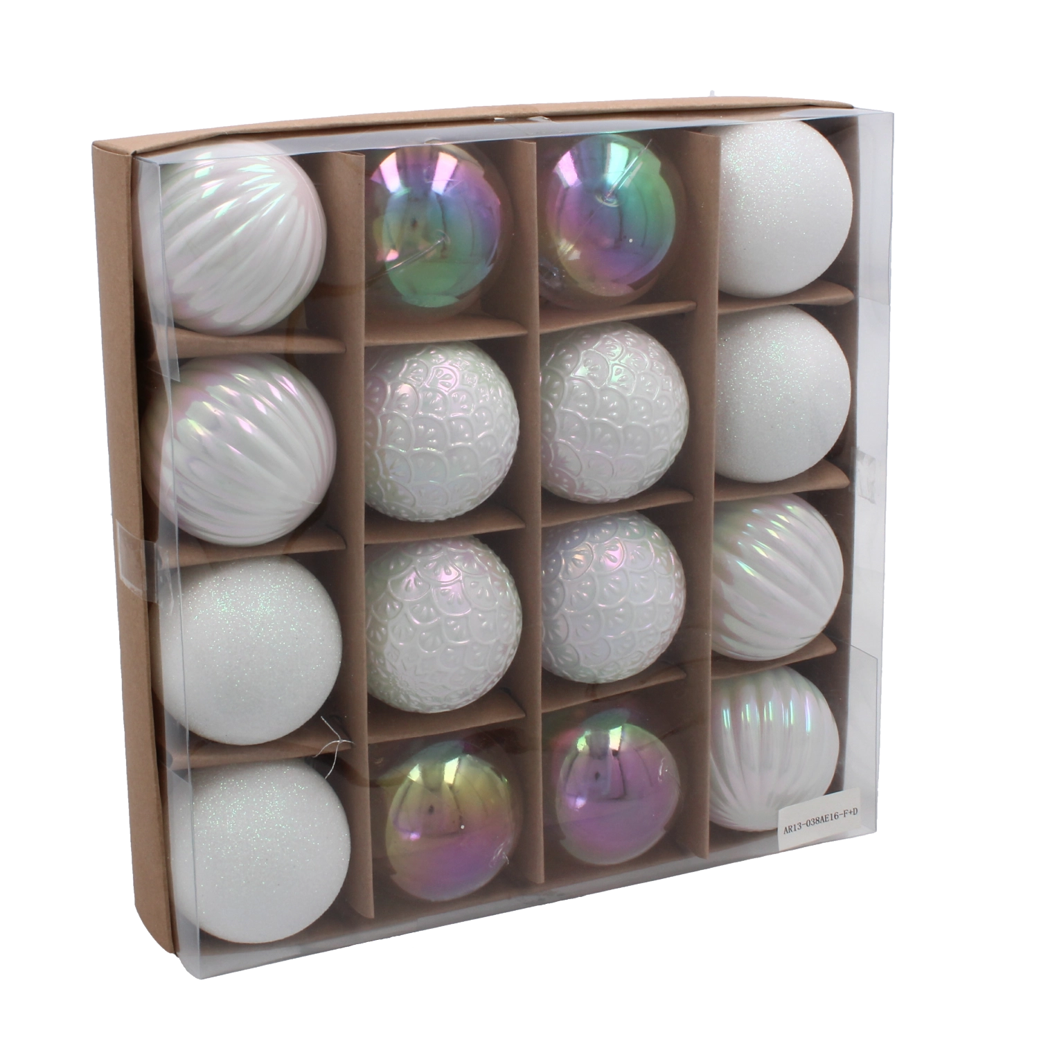 Zahvaljujoč nelomljivi plastiki so okraski varni, lahki in enostavni za obešanje. Kombinacija površin – gladek sijaj, perlaste odseve ali nežne teksture – prinaša globino in eleganten lesk v vsak kotiček vašega doma.