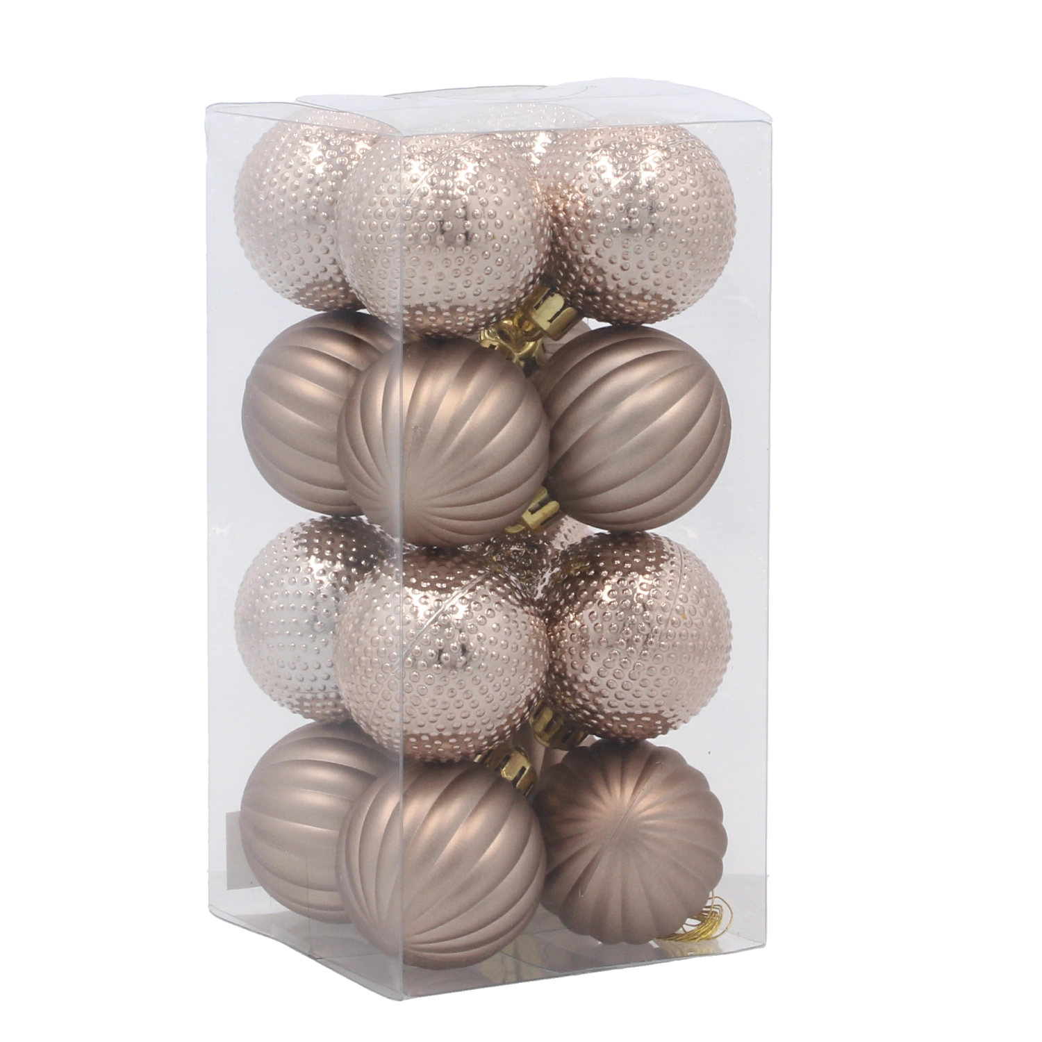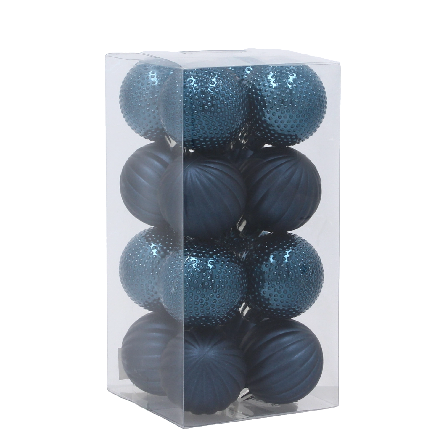 Kombinacija reliefnih in rebrastih krogel ustvari igro svetlobe in sence, ki poživi vsako jelko in dekoraciji doda globino.