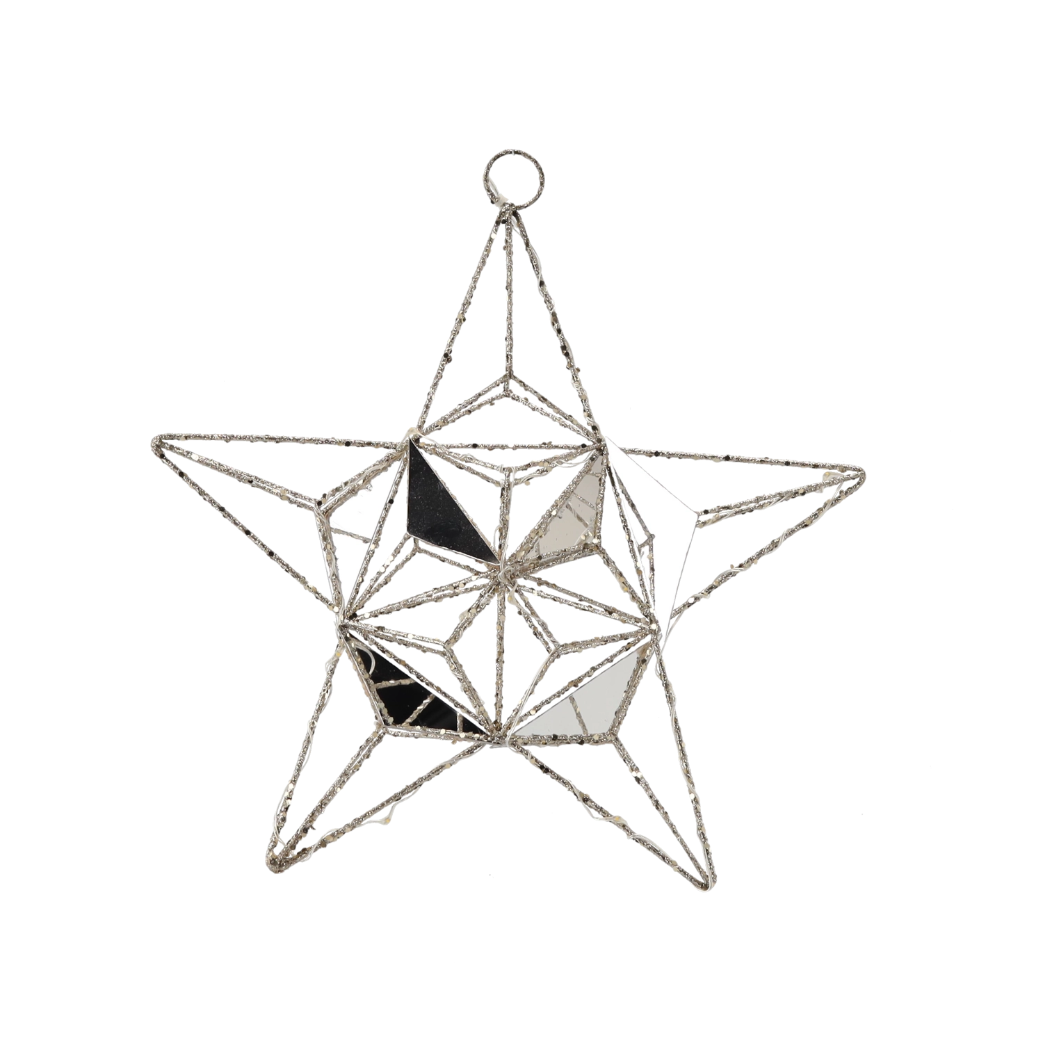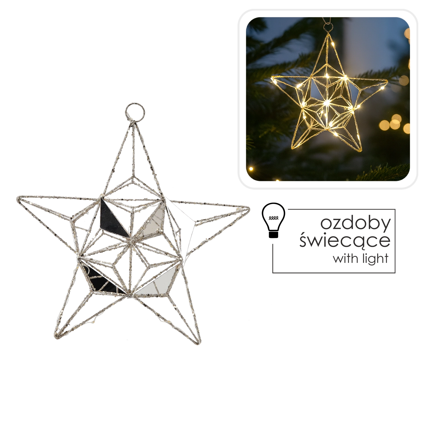 Ta elegantna božična zvezda z vgrajenimi energetsko varčnimi LED diodami pričara prijetno atmosfero in nežen lesk. Kovinska žična konstrukcija s fasetiranimi elementi in zrcalnimi ploskvami odbija svetlobo ter dekoraciji daje razkošen videz.