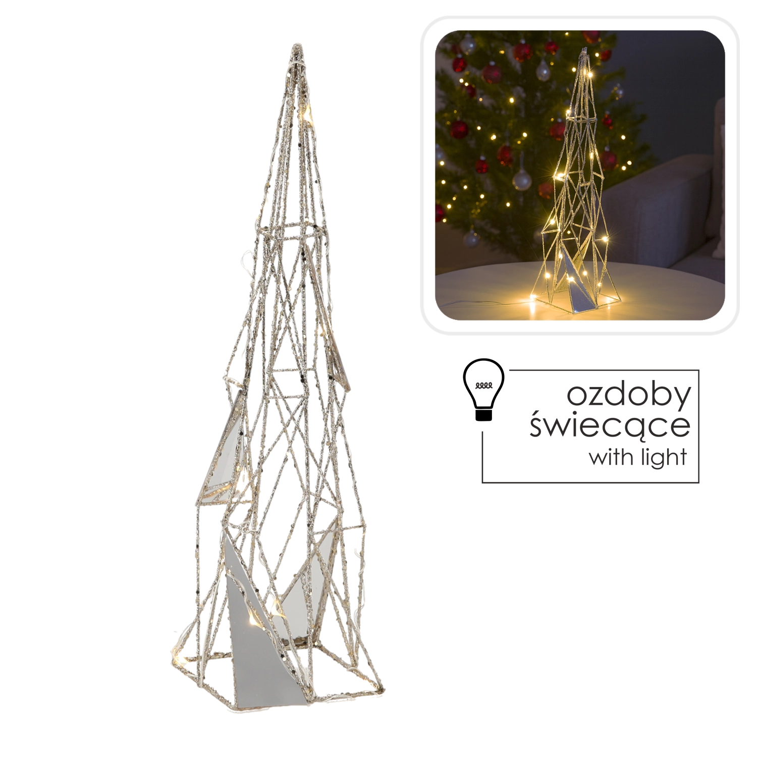 Sodoben, minimalističen dizajn v obliki geometrijskega drevesca izstopa na komodi, klubski mizici ali v oknu. Toplo belo svetlobo 30 LED odlikuje prijetna sijajnost, ki poudari čar božiča in interierju doda eleganten praznični značaj.