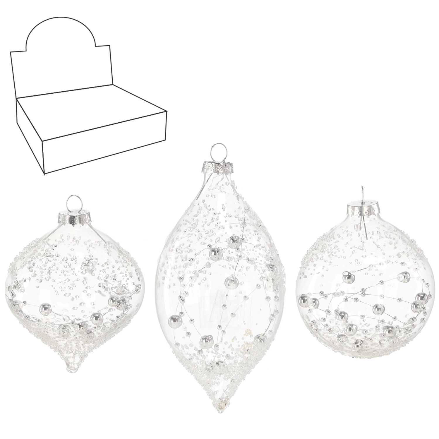 Popestrite božično drevo in sezonske aranžmaje s prozornimi steklenimi kroglicami v mešanici vzorcev. Prozorno steklo lepo odbija svetlobo, zato delujejo okraski nežno in elegantno v vsakem interierju. Kombinacija okroglih in podolgovatih oblik prinaša vizualno raznolikost in omogoča enostavno usklajevanje z drugimi dekoracijami.