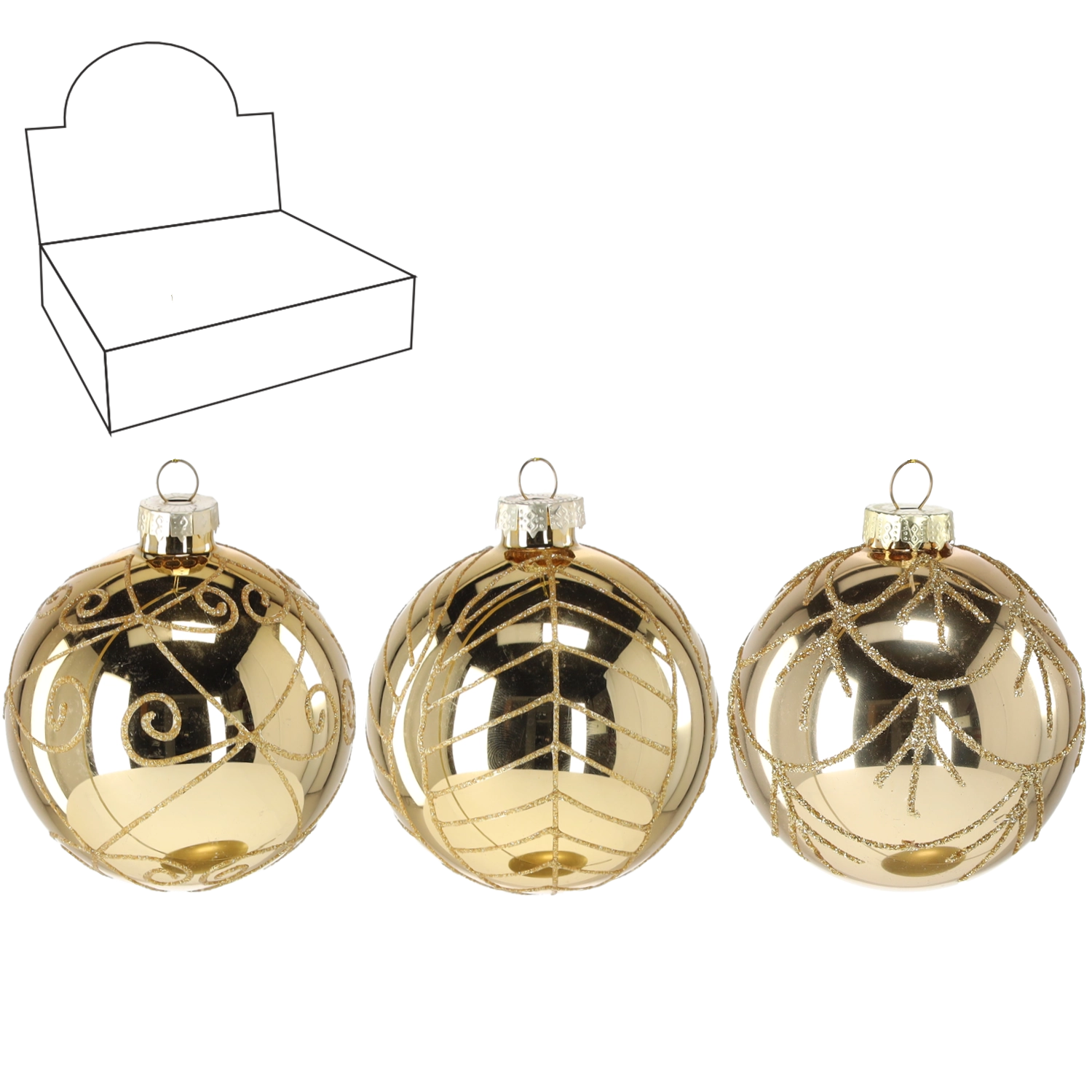 Ta steklena božična krogla je idealna izbira za vse, ki želijo svojemu interierju dodati luksuzno in slavnostno vzdušje. Bleščeča zlata površina in precizna brokatna dekoracija poudarita svetlobo božičnih lučk in zažarita tako na klasičnem kot modernem drevesu.
