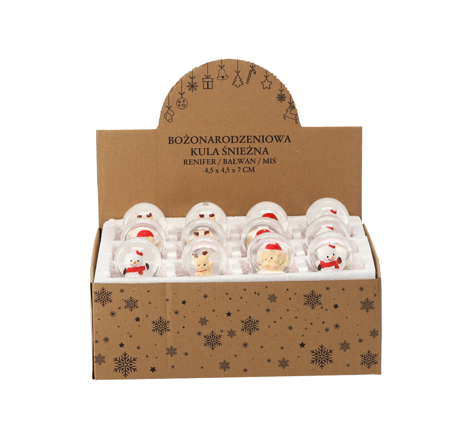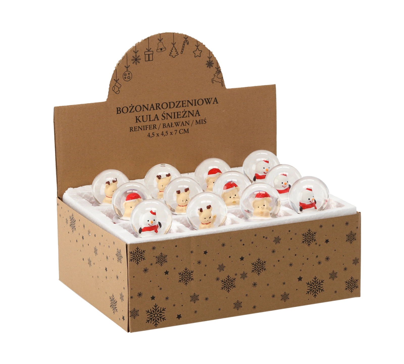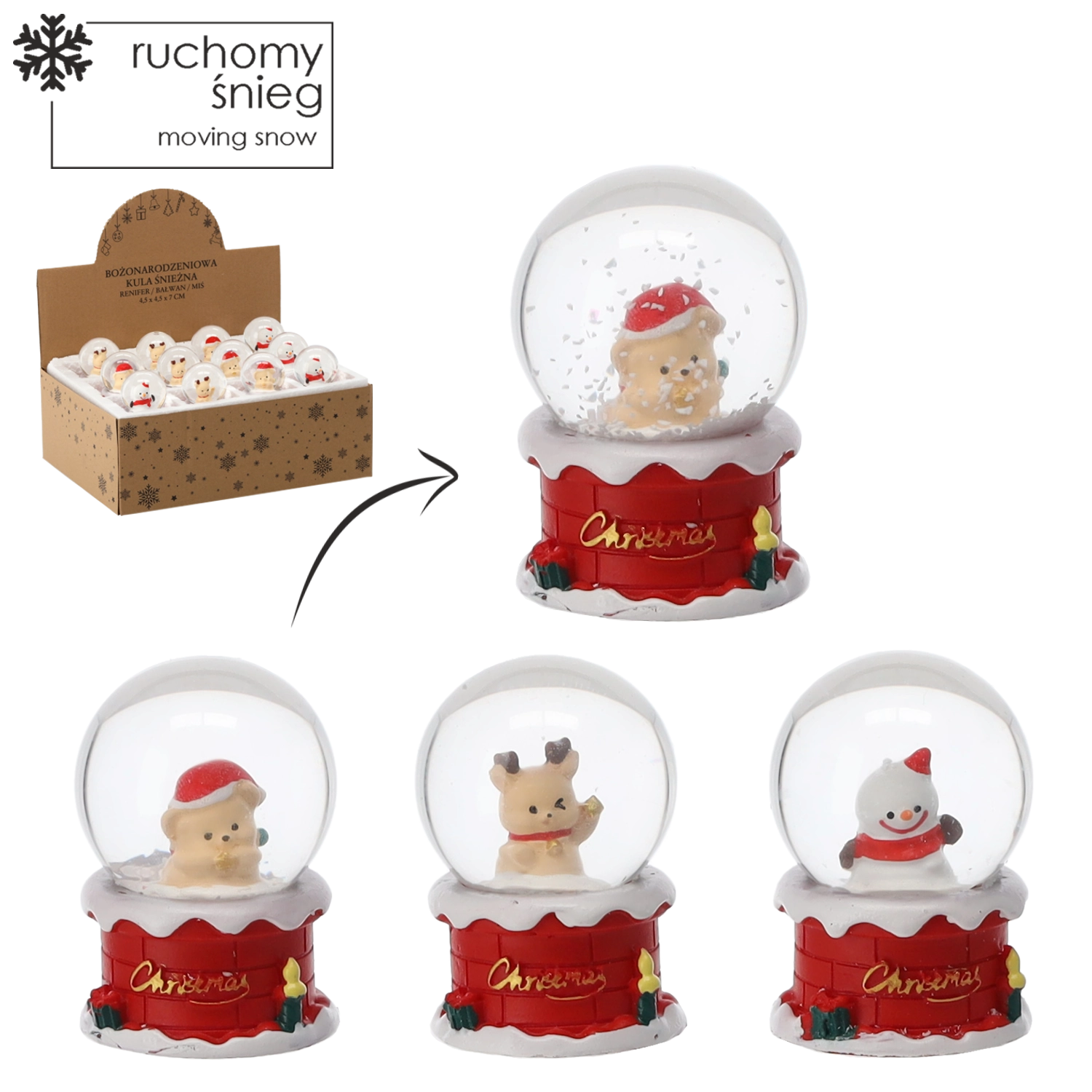 Prisrčna božična snežna krogla z figurico jelena, snežaka ali medvedka prinese v vsak dom čar božiča. Ko jo stresete, se v notranjosti zavrtinči bleščeči »sneg« in ustvari takojšnje praznično vzdušje. Zaradi kompaktnih mer je primerna za polico, pisalno mizo ali okensko polico in je odlična ideja za drobno darilo za otroke in odrasle.