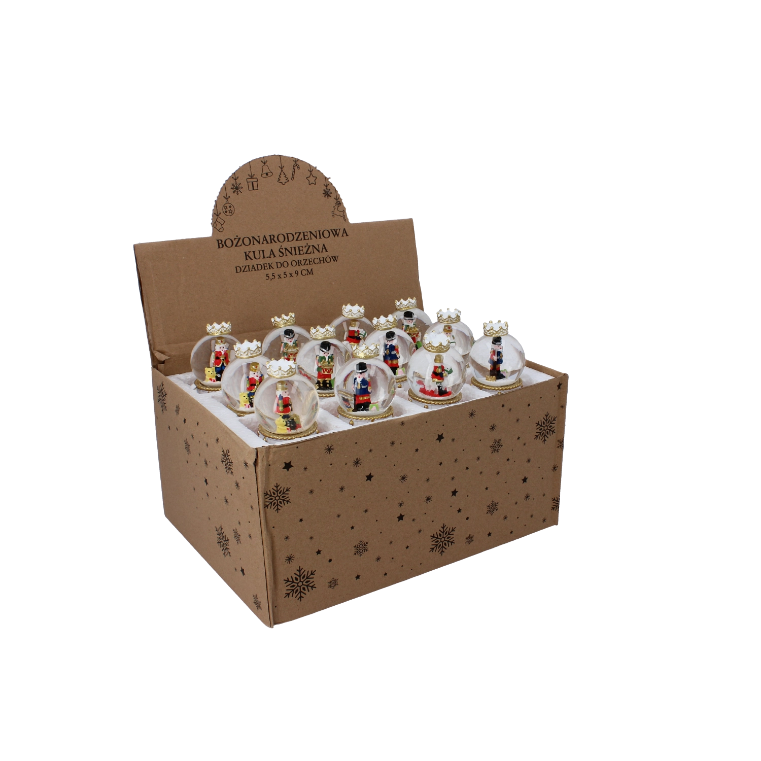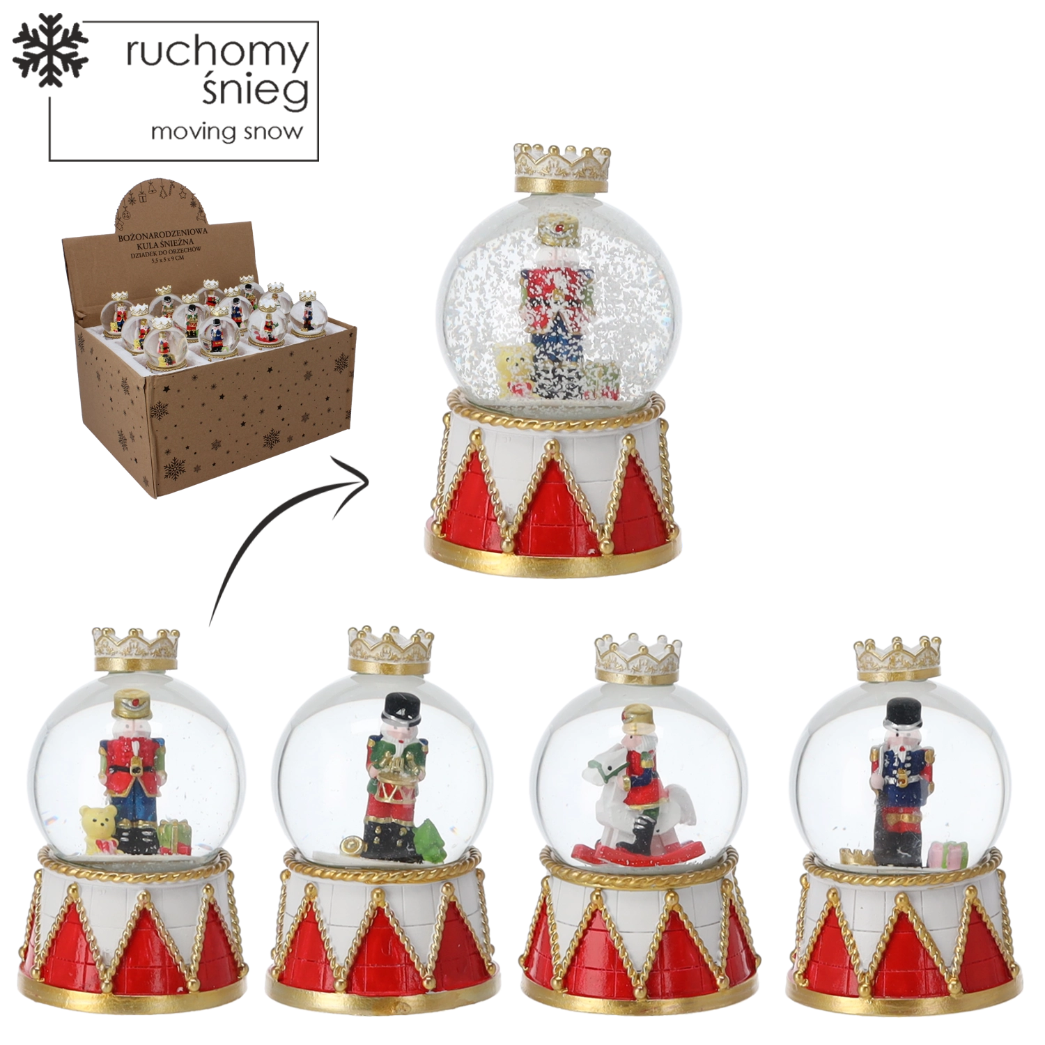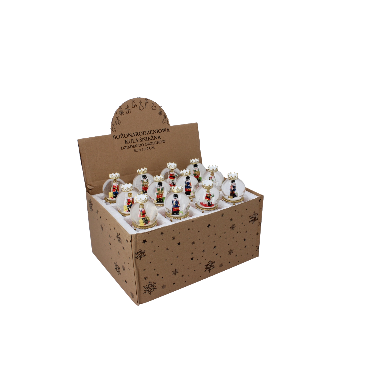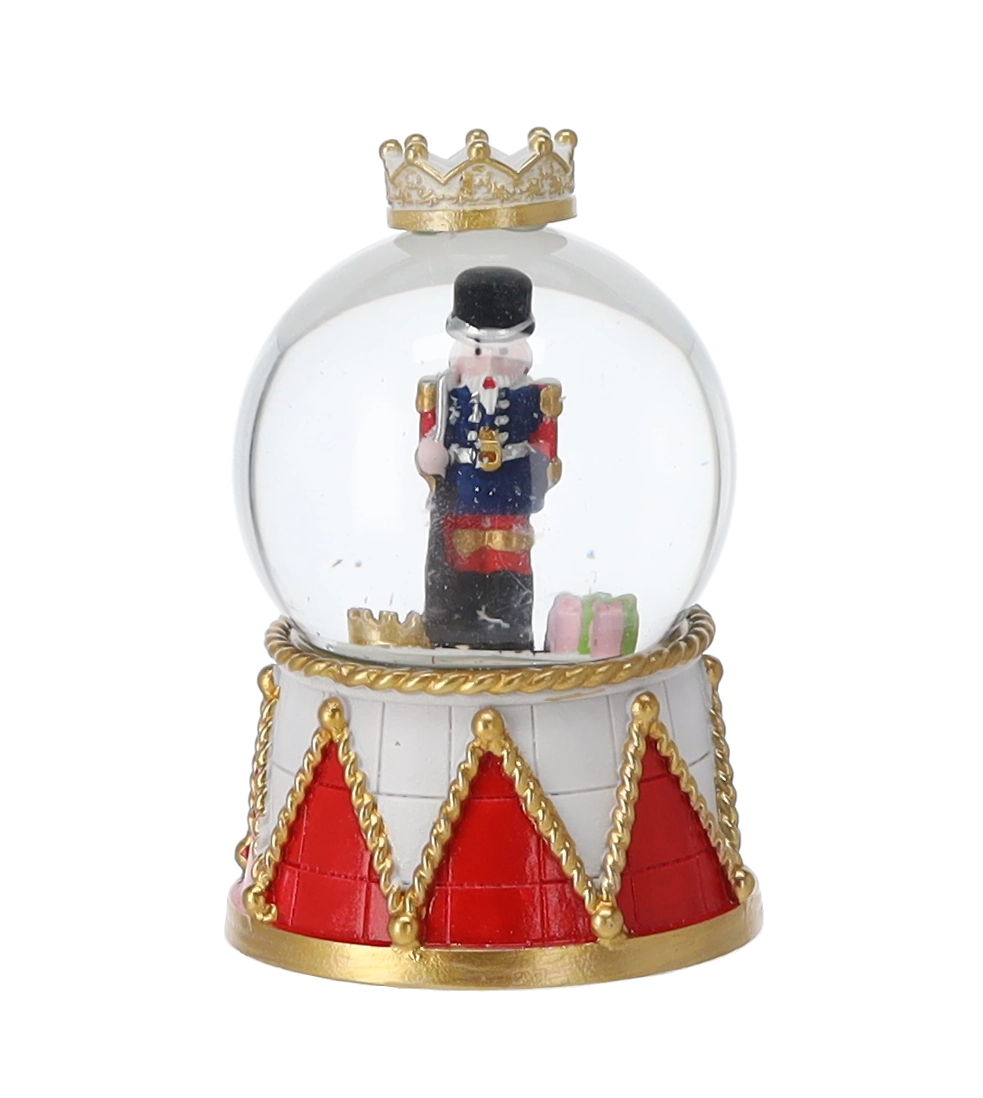 Čarobna božična dekoracija, ki v dom prinese tradicijo in lesk. Po rahlem pretresu se v krogli zavrtinči bleščeči »sneg« okoli ikonične figure hrestača. Idealna kot darilo in elegantni okras za komodo ali polico. Steklena kupola, bogato okrašen podstavek v slogu bobna in mešanica različnih motivov za edinstveno praznično aranžiranje.