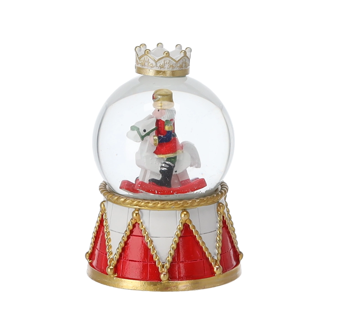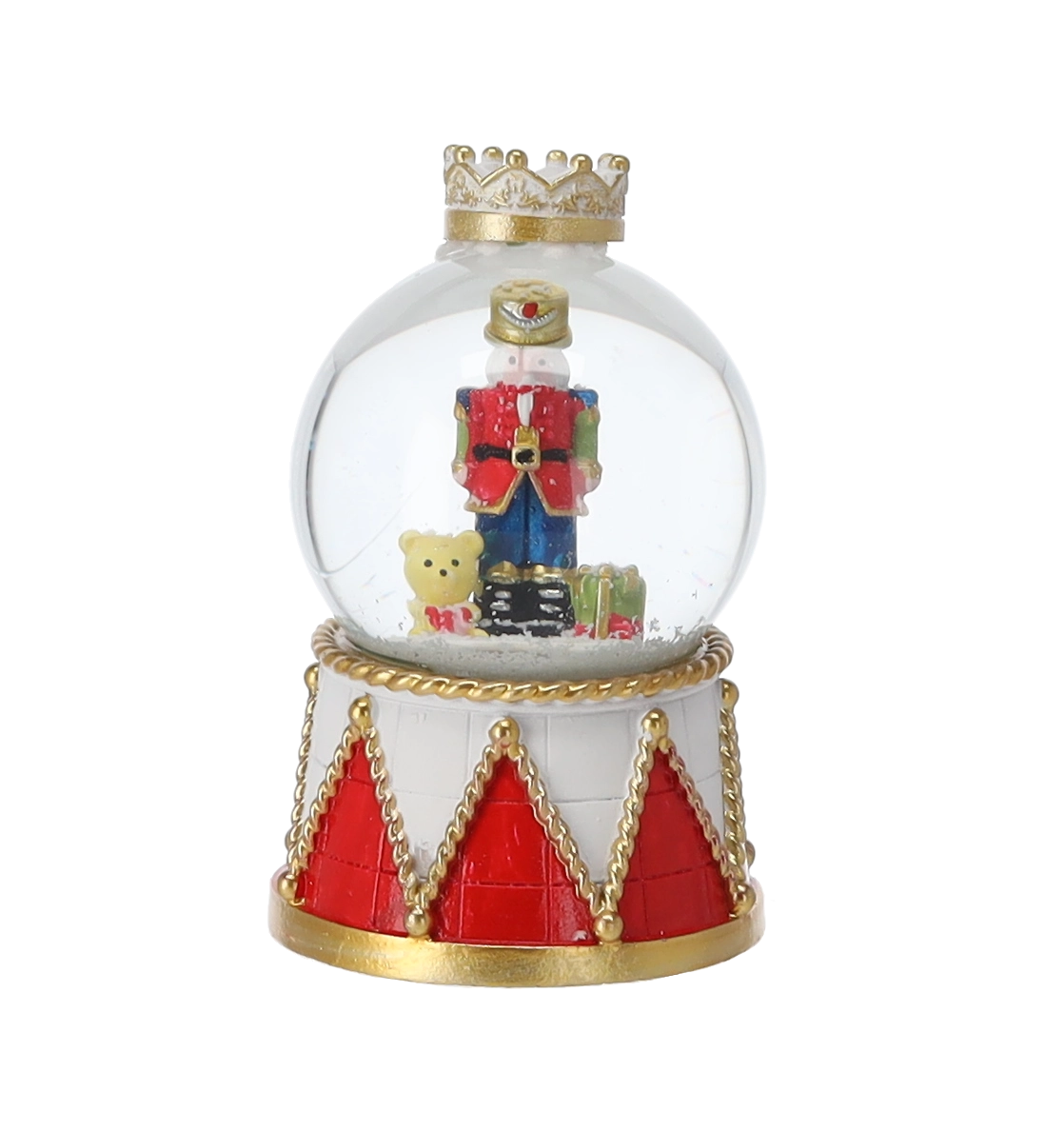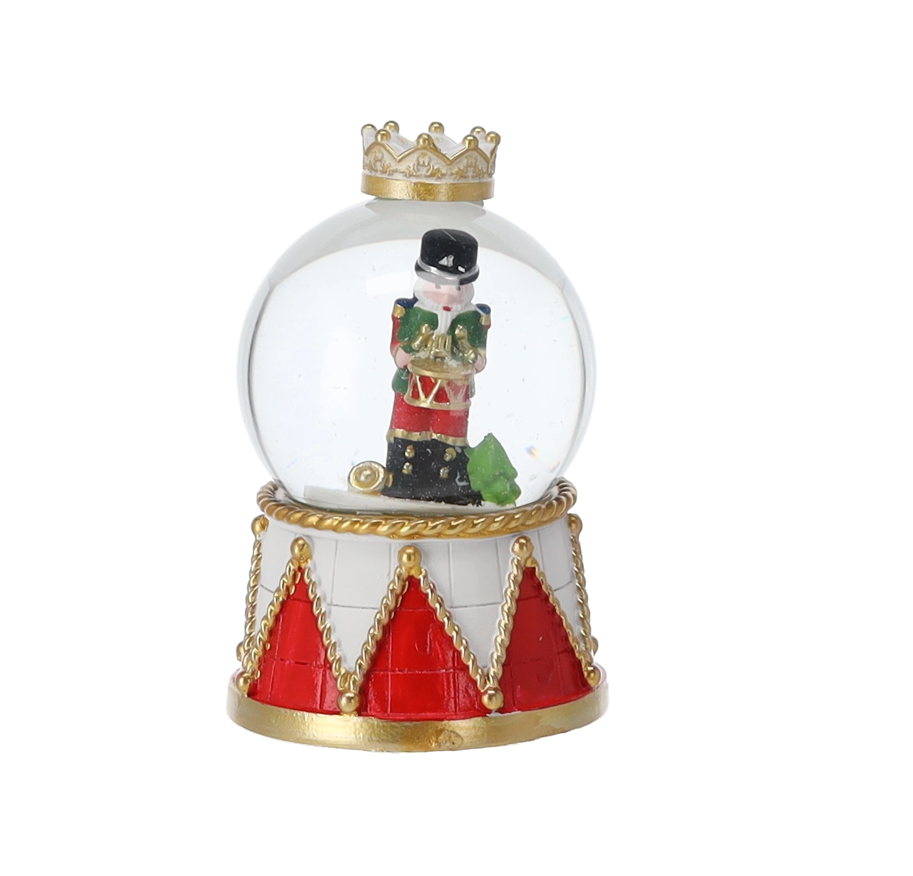 Vsak kos krasi prosojna steklena kupola in dekorativni podstavek v rdeče‑zlatem bobnarskem dizajnu s krono. Kompaktne mere omogočajo postavitev na klubsko mizico, polico ali praznično mizo. Zahvaljujoč mešanici motivov hrestačev kroglo zlahka uskladite z ostalimi okraski.