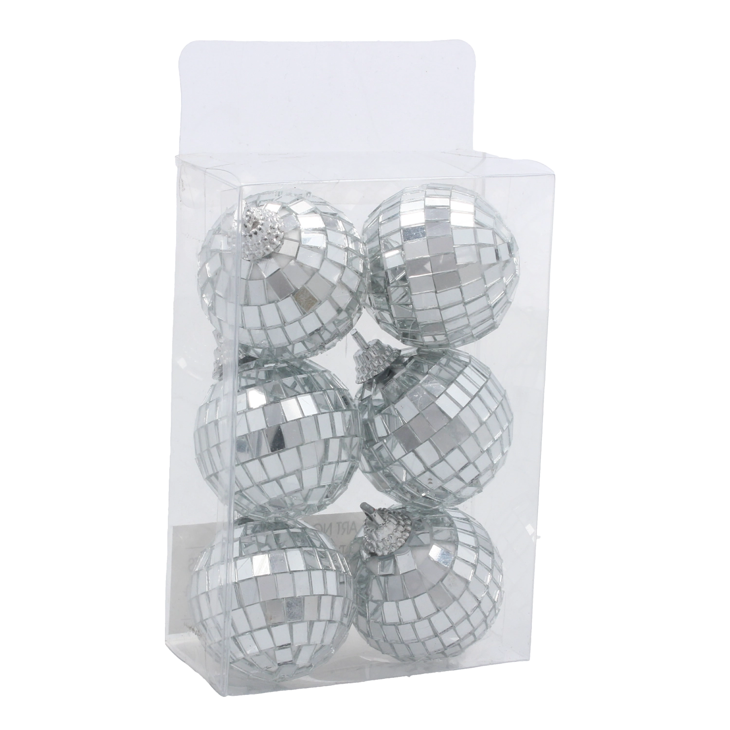 Vnesite v svojo praznično dekoracijo svež lesk s setom šestih srebrnih krogel v slogu disco. Zrcalni učinek odbija okolno svetlobo in ustvarja bleščeče vzdušje, ki izstopa na božičnem drevesu, venčkih in namiznih dekoracijah.
