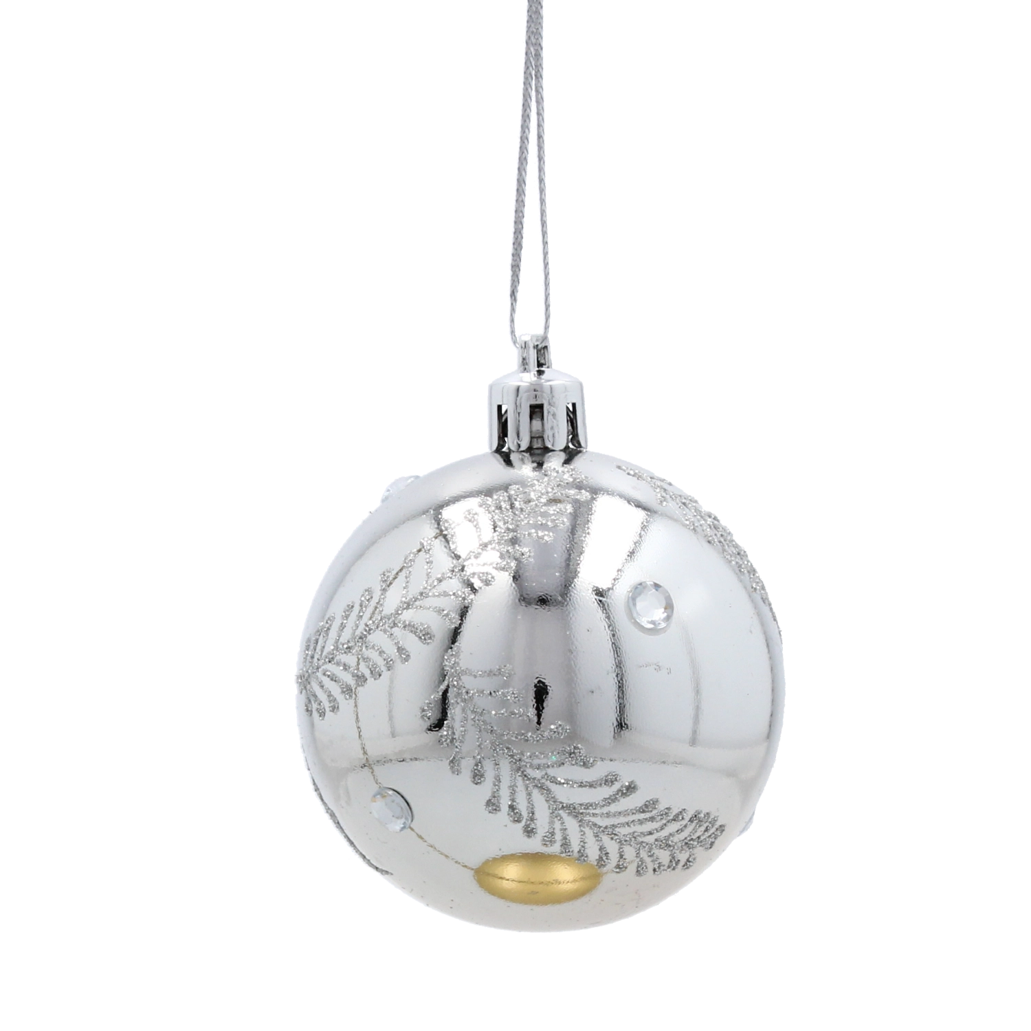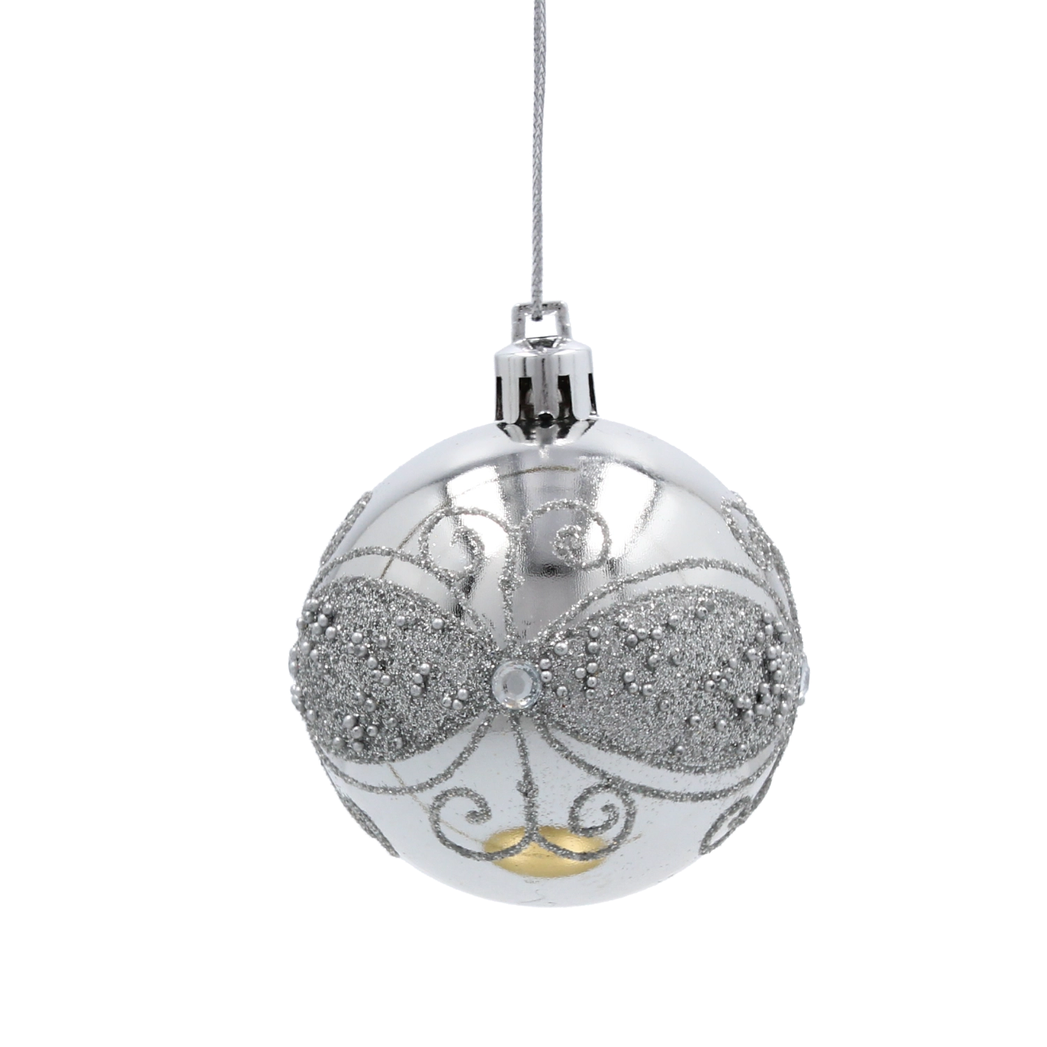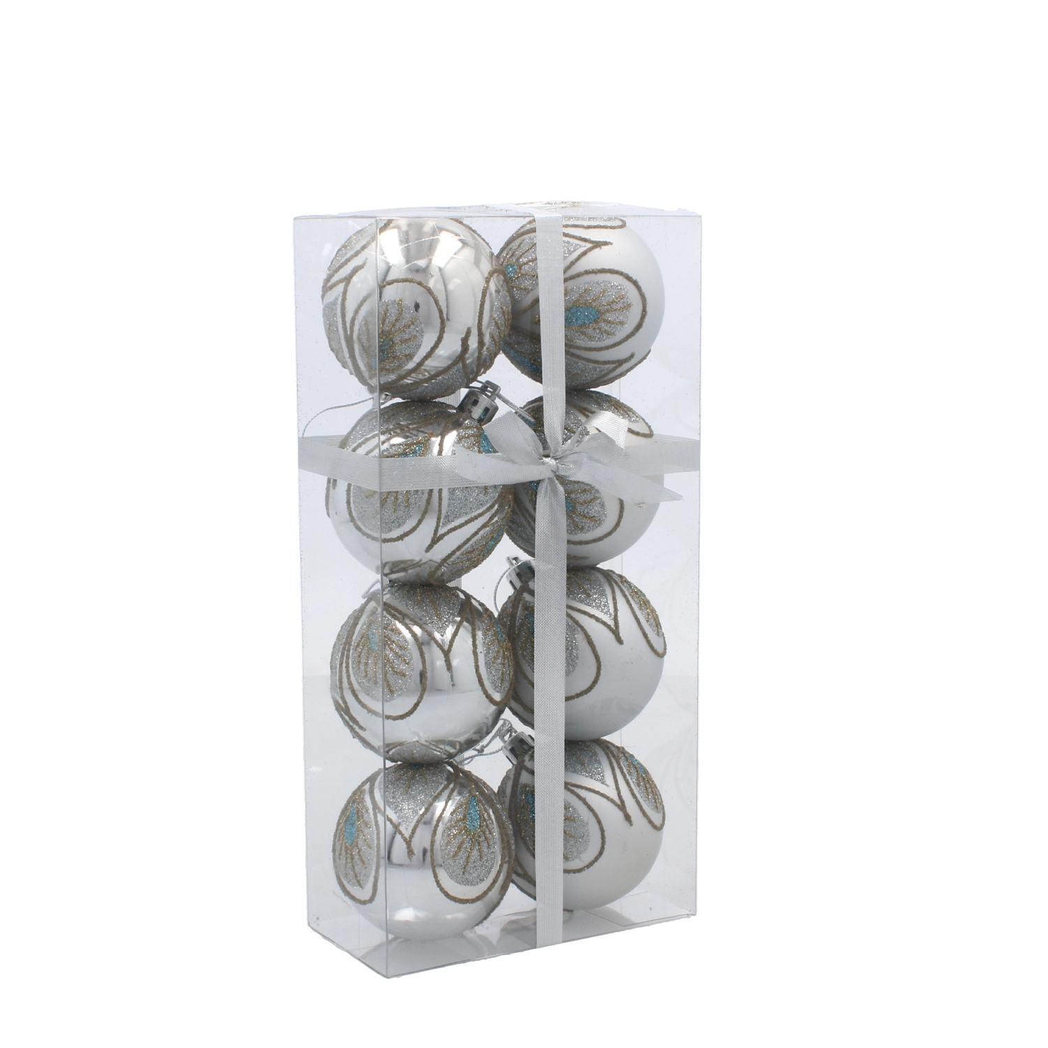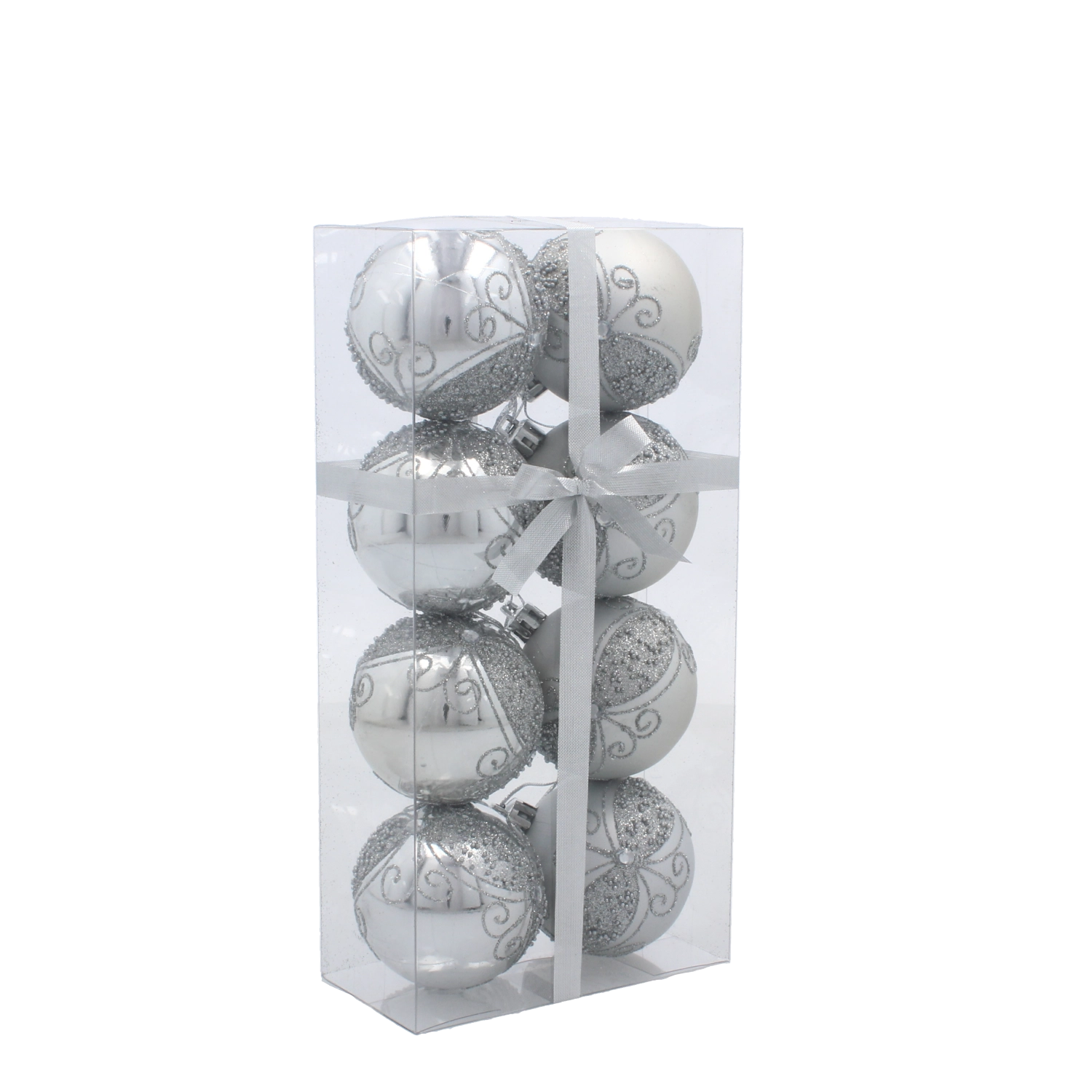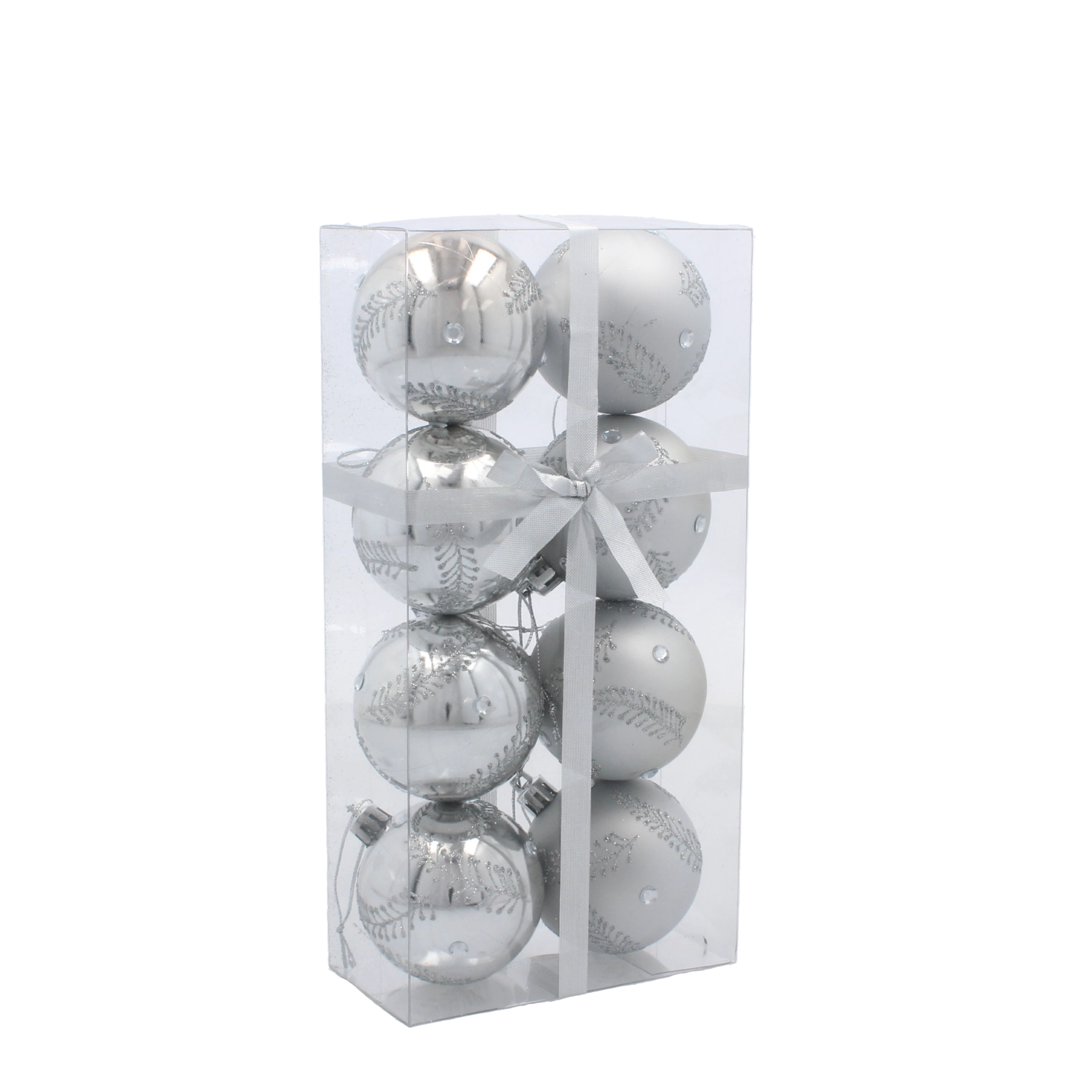 Ta komplet 8 srebrnih božičnih krogel prinaša univerzalen in brezčasen slog v vsak dom. Srebrna barva se odlično poda k topli in hladni osvetlitvi ter poudari razkošen videz božične dekoracije. Zahvaljujoč trpežni plastični izvedbi se vam ni treba bati razbitja pri obešanju ali shranjevanju.