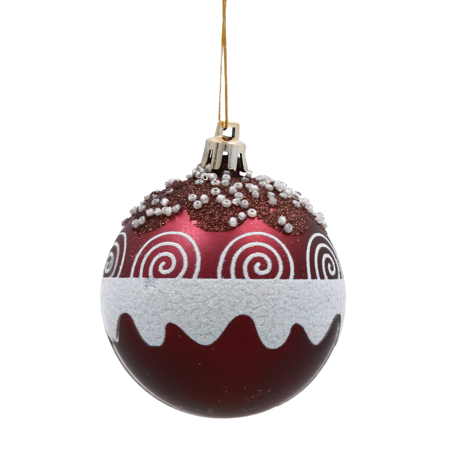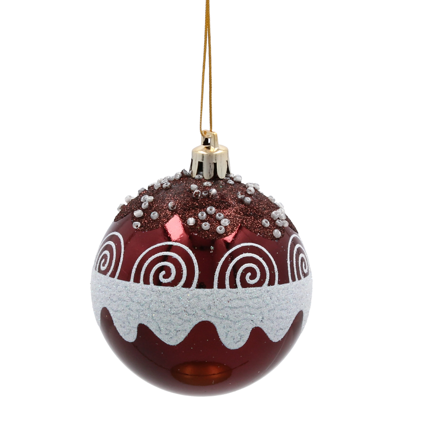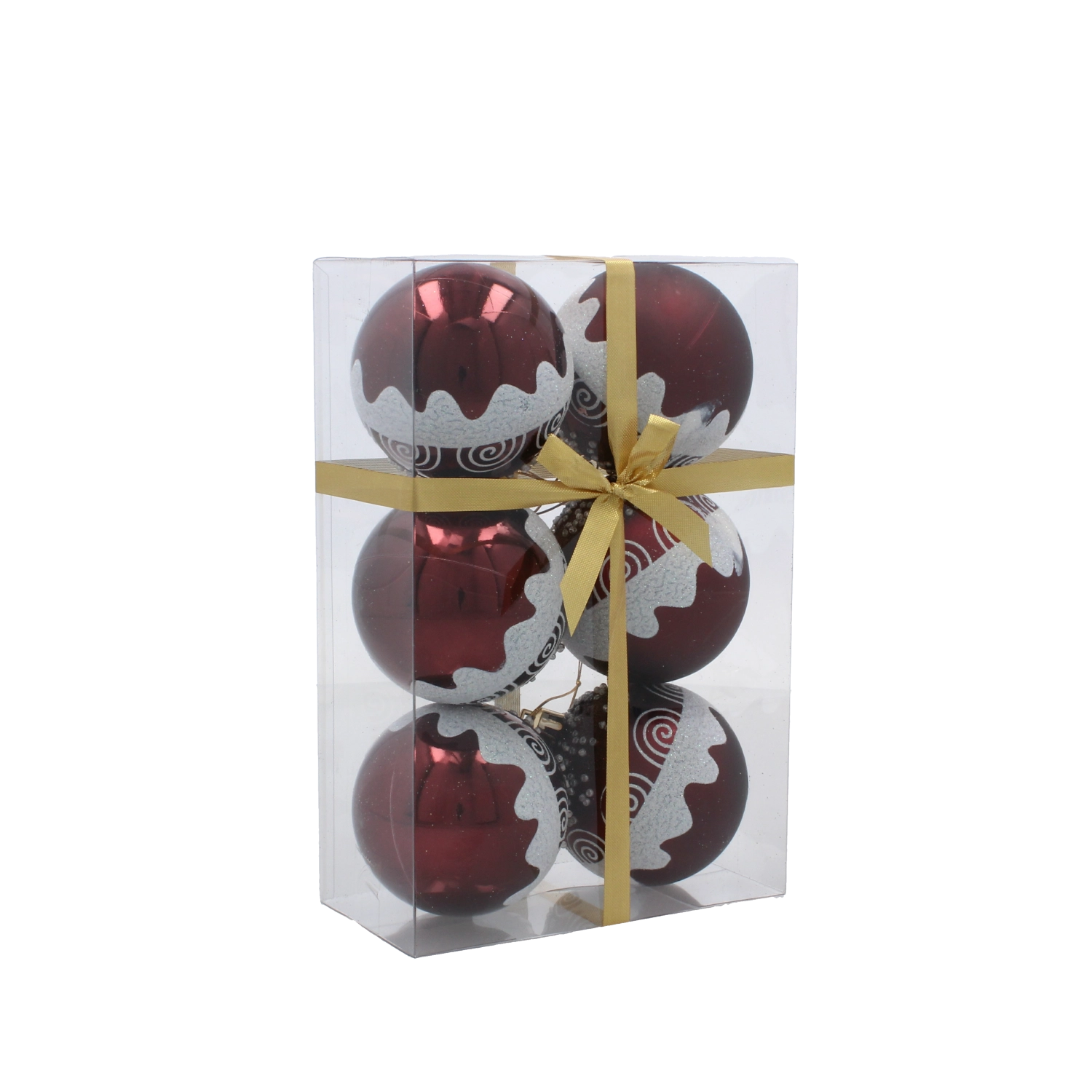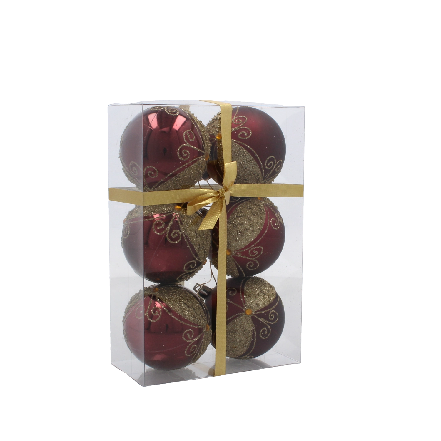 Ta komplet 6 okraskov v bogati burgundsko rdeči barvi z nežnimi zlatimi ornamenti in biserčki v dom vnese pridih razkošja. Zaradi nelomljivega materiala so primerni za družine z otroki in ljubljenčki, hkrati pa ohranjajo sijaj in reprezentativen videz, primeren za klasični in glamur slog.