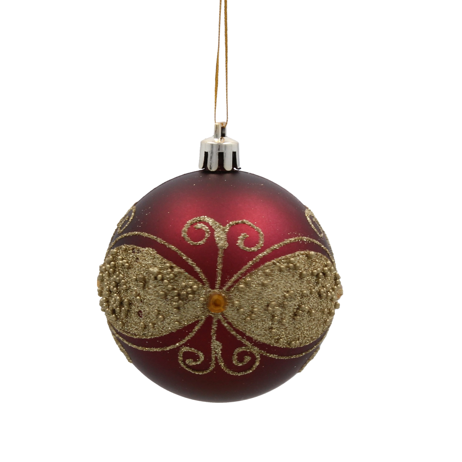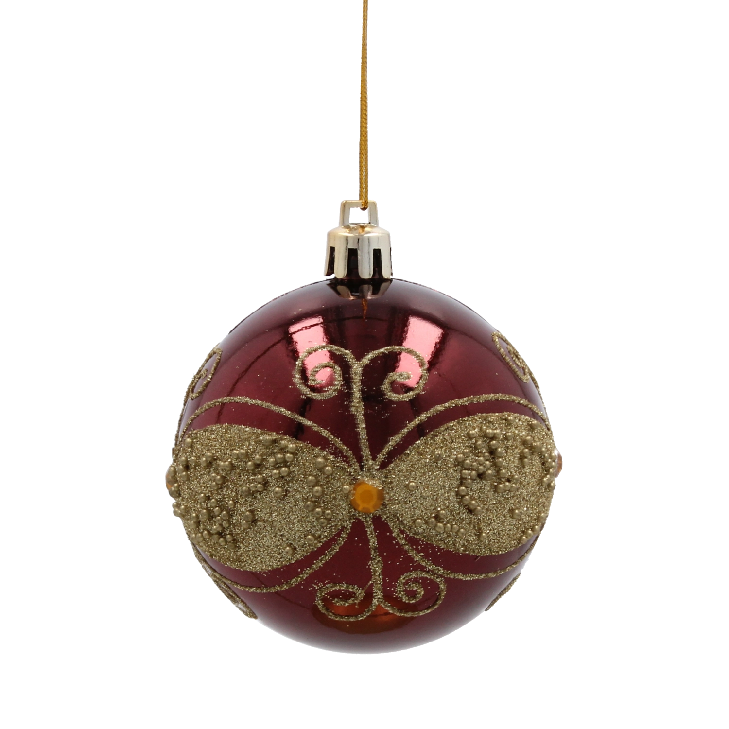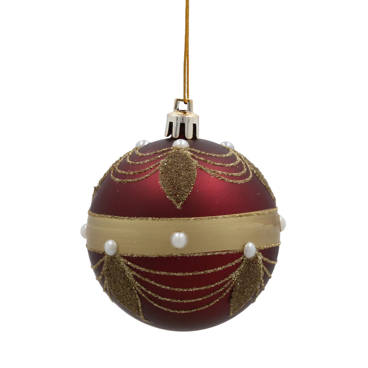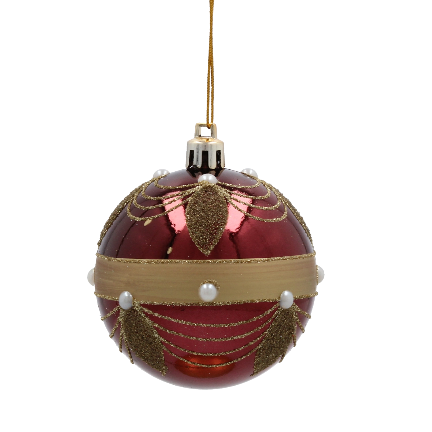 Globok burgundsko rdeč odtenek v kombinaciji z zlatimi linijami, listi in biserčki doda drevescu in aranžmajem izjemen, slovesen lesk.