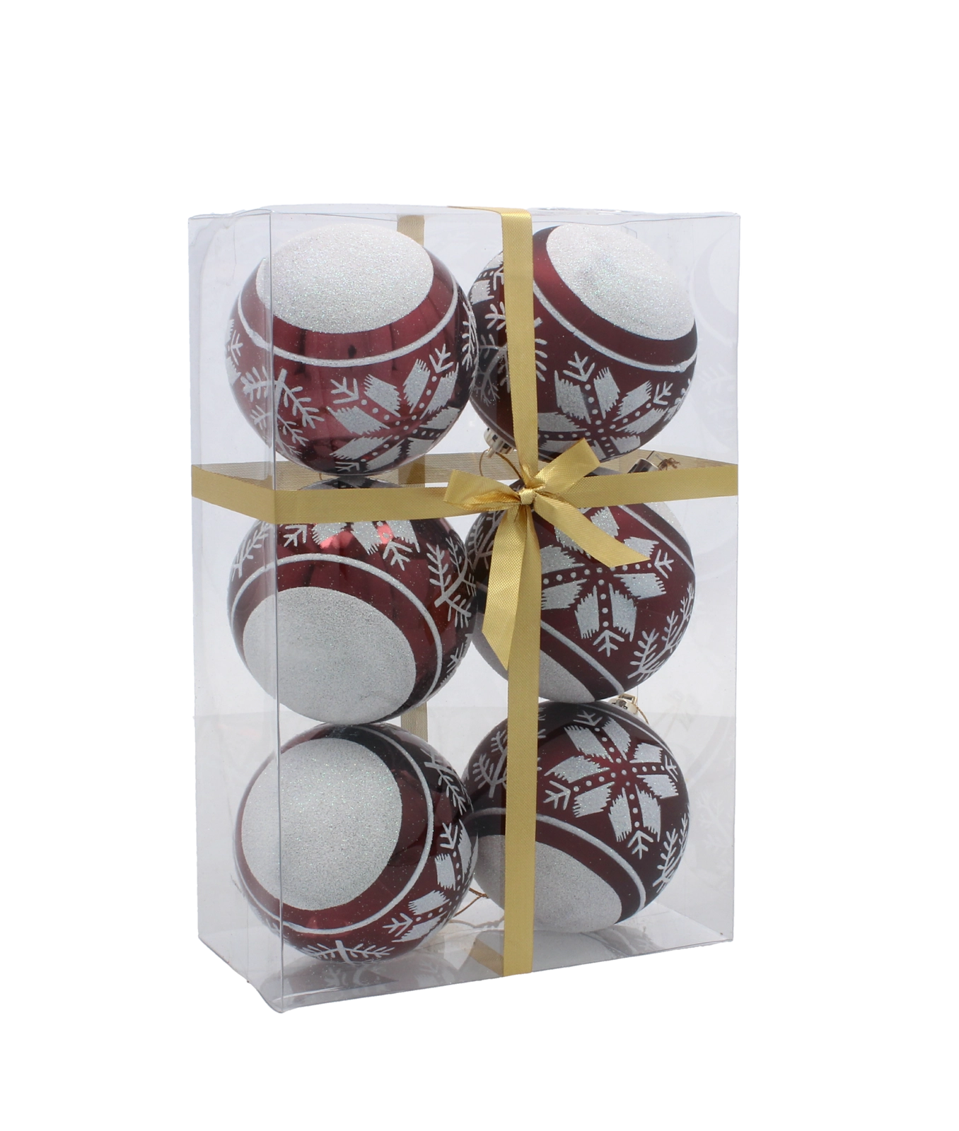 Ta set vsebuje 6 skrbno usklajenih okraskov v bogati bordo barvi. Vsaka krogla je okrašena z nežnimi zlatimi motivi ter združuje mat in sijočo izvedbo za izrazit kontrast in praznični lesk. Univerzalni premer 8 cm je primeren za manjša in večja drevesca ter se zlahka kombinira z drugimi dekoracijami.