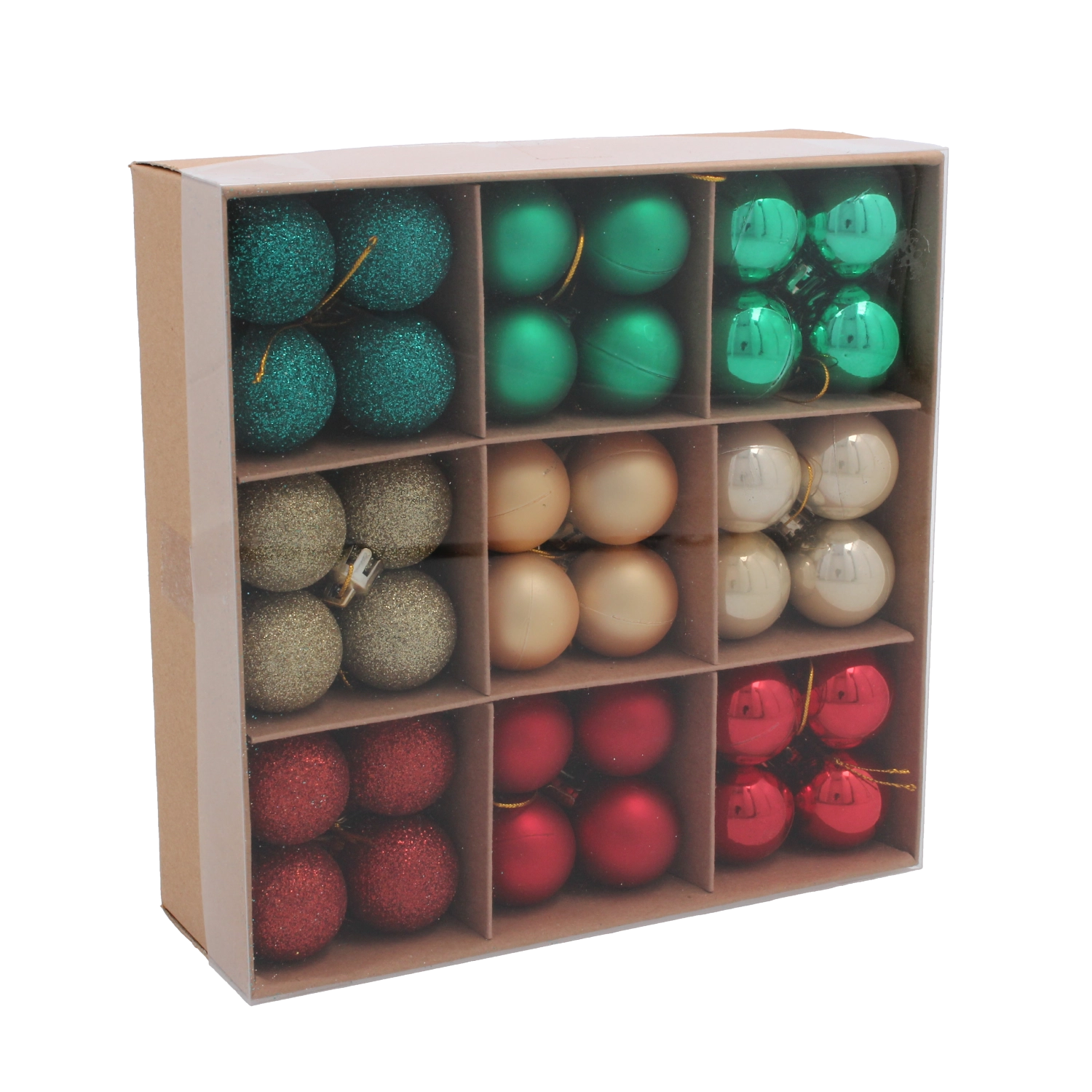 Ta vsestranski set božičnih krogel v priročni škatli ponuja bogat izbor barv in površinskih obdelav za popolno uskladitev s preostalo dekoracijo. Kompaktni premer 3 cm je idealen za tanjše veje, manjše jelkice in kreativne DIY projekte.