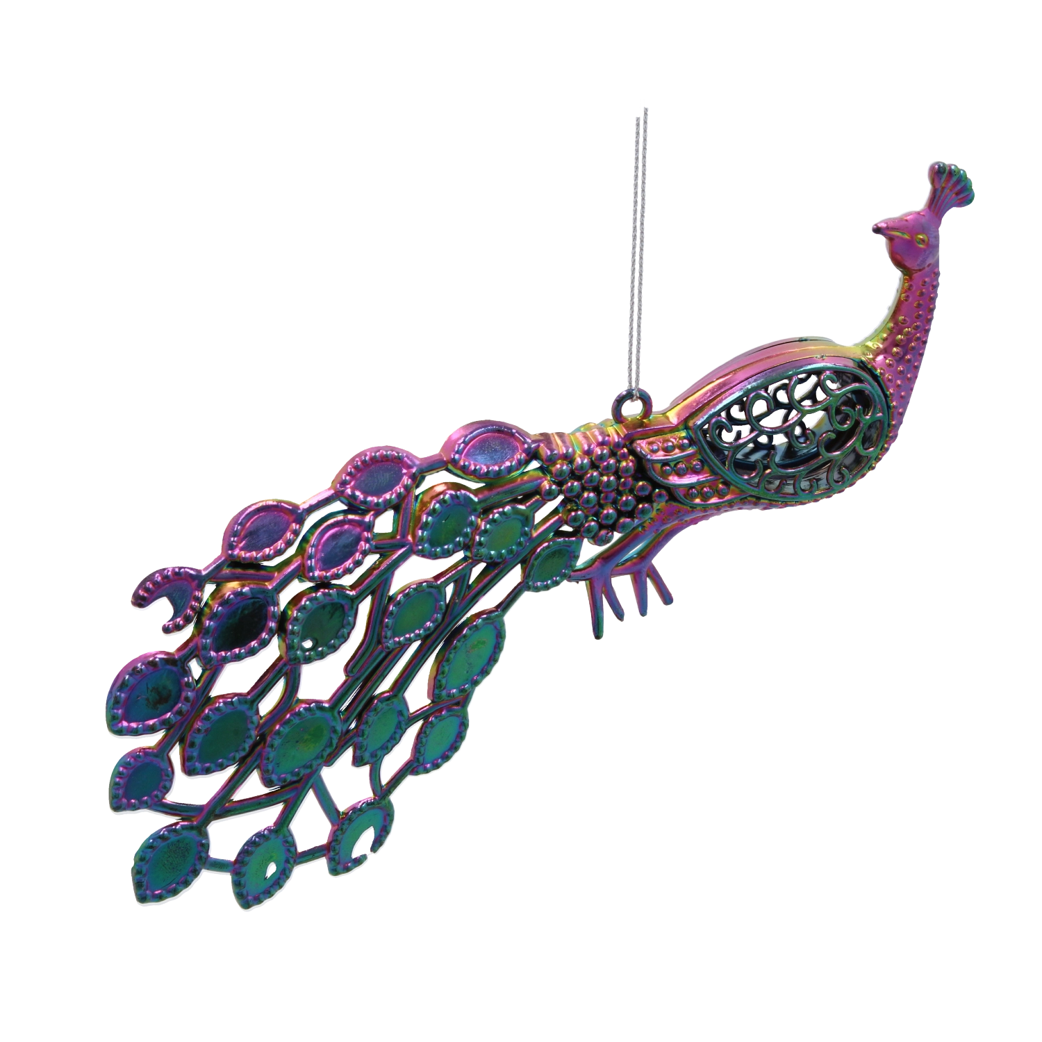 Eleganten božični okrasek v obliki pava bo vaši dekoraciji dodal edinstven sijaj in prečiščen videz. Posebna površina z mavričnim učinkom, ki spominja na oljne odseve, se spreminja glede na kot svetlobe in ustvarja očarljive barvne prelive. Lahek in trpežen plastičen material ter praktična sponka omogočata enostavno pritrditev na veje drevesca, girlande, vence in namizne dekoracije.