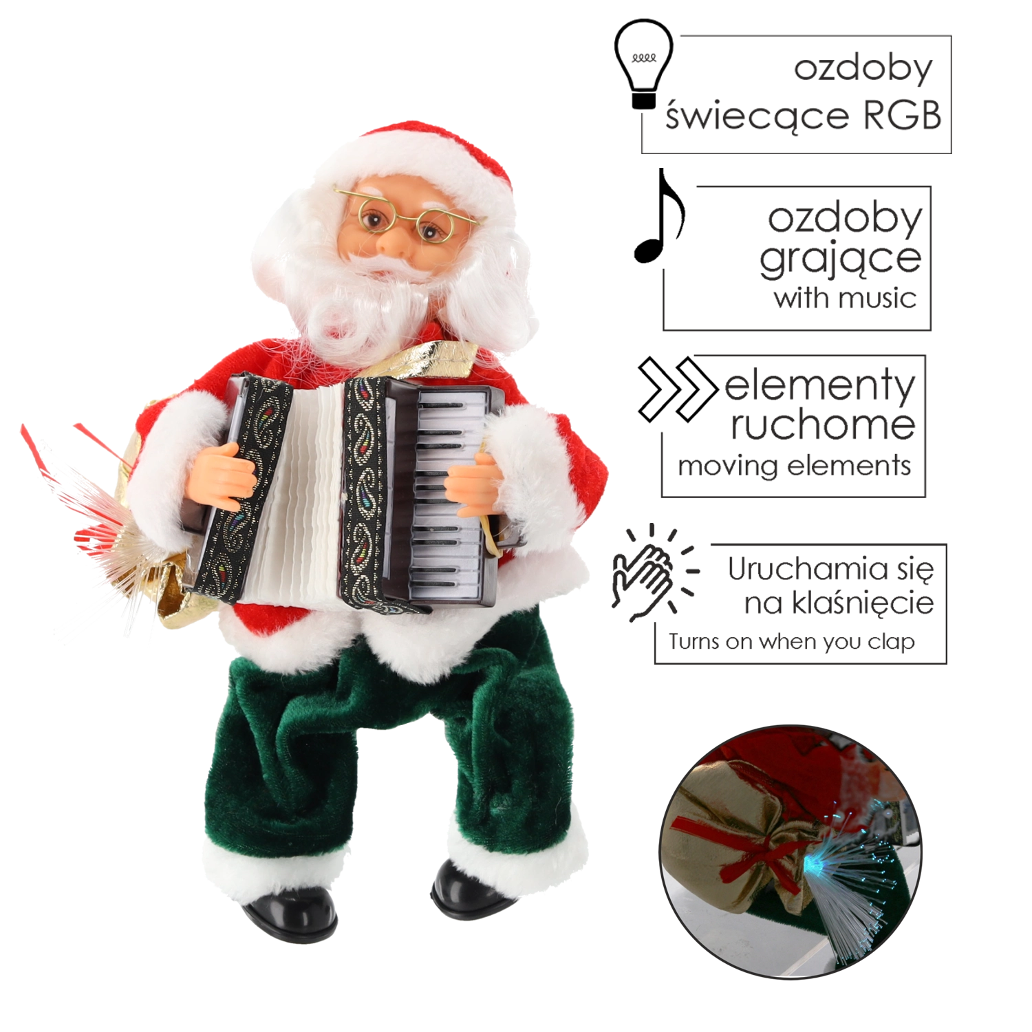 Vnesite v dom čar božiča s figurico BOŽIČKA, ki predvaja vesele melodije, premika roke in harmoniko ter ima svetlečo LED vrečo. Zahvaljujoč aktivaciji na zvok je dovolj plosk in Božiček oživi – idealen okras za mizo, komodo ali izložbo.
