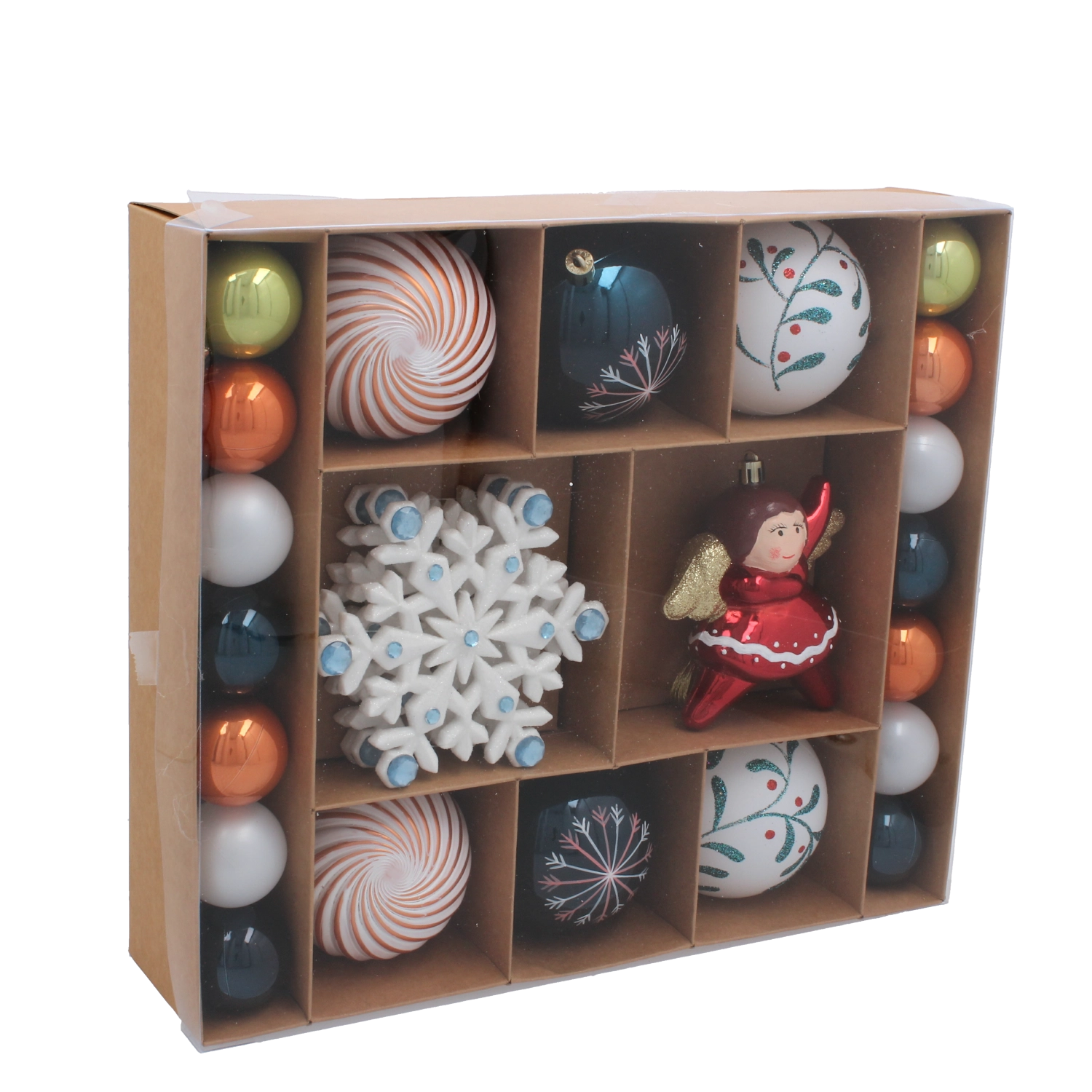 Ta univerzalni set ponuja harmonično kombinacijo sijočih krogel, snežink in figuralnih okraskov, s katerimi boste zlahka uskladili dekor z modernim ali tradicionalnim slogom. Vsak kos je zasnovan za hitro in varno obešanje, da je okraševanje veselje za vso družino.
