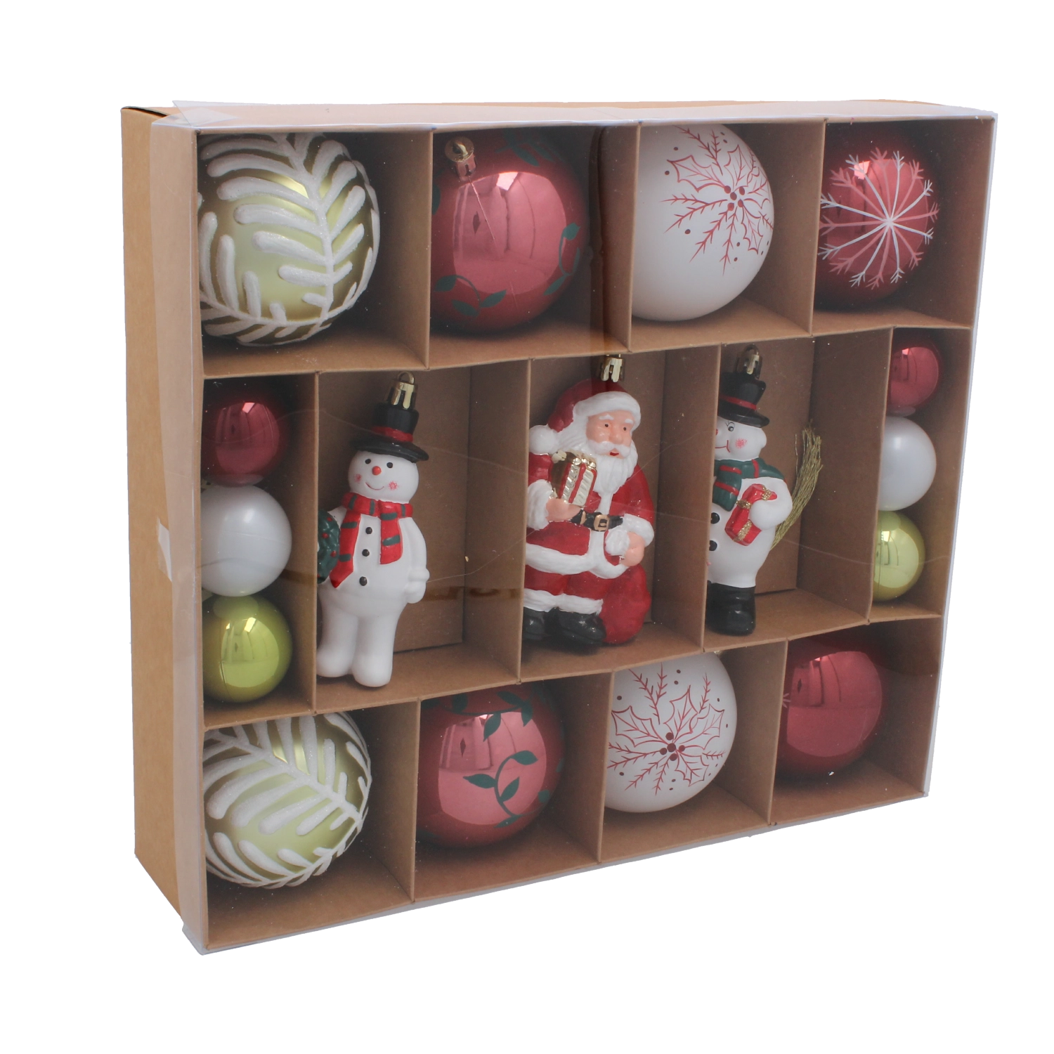 Ustvarite popolnoma usklajeno božično dekoracijo s kompletom 23 okraskov v skrbno izbranem prepletu barv in oblik. Sijoča površinska obdelava poudari odseve lučk na jelki in dekoracijam doda razkošen videz, medtem ko trpežna plastična izvedba zagotavlja dolgo življenjsko dobo in enostavno rokovanje.
