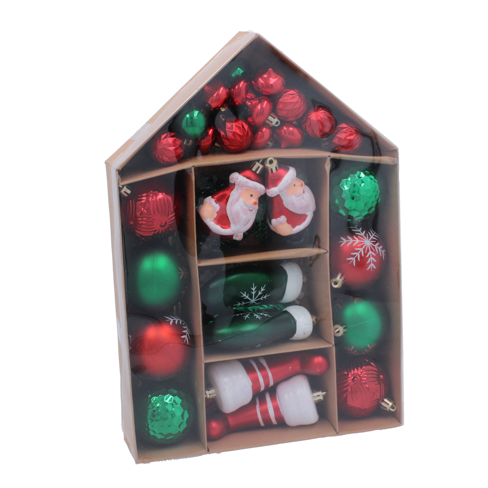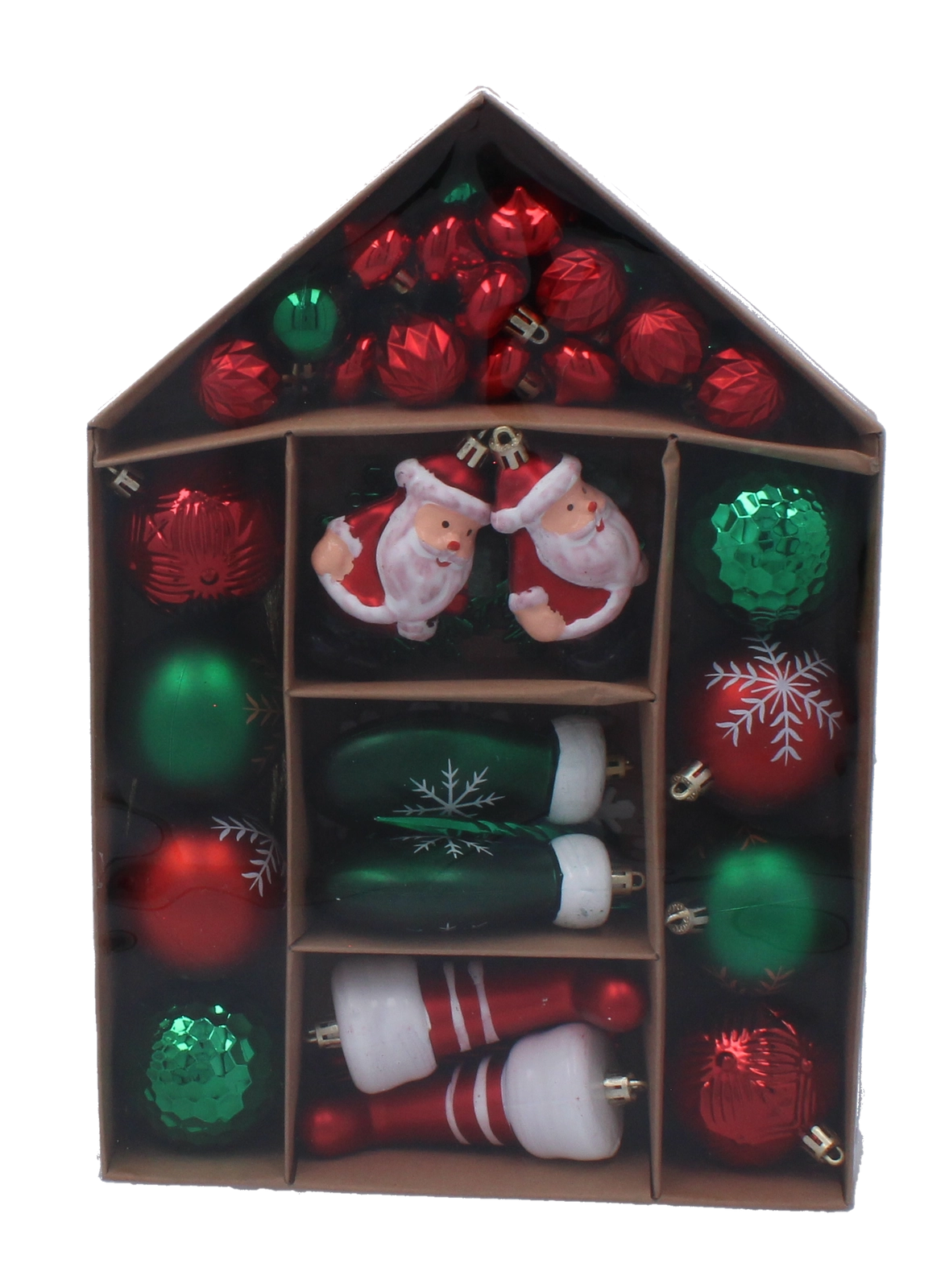 Okraski so izdelani iz kakovostnega, nelomljivega plasta, zato so idealni za domove z otroki in hišnimi ljubljenčki. Lahka zasnova varuje veje, zahvaljujoč obešalnim zankam pa je okraševanje hitro in udobno. Prozorna, hišasta škatla z ročajem ohranja vse pregledno razporejeno ter olajša prenašanje in shranjevanje po praznikih.