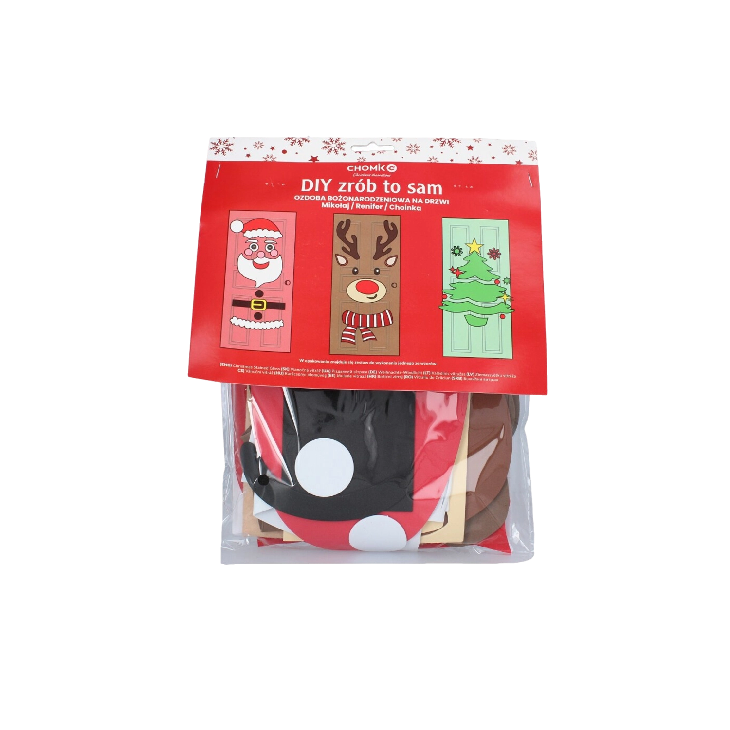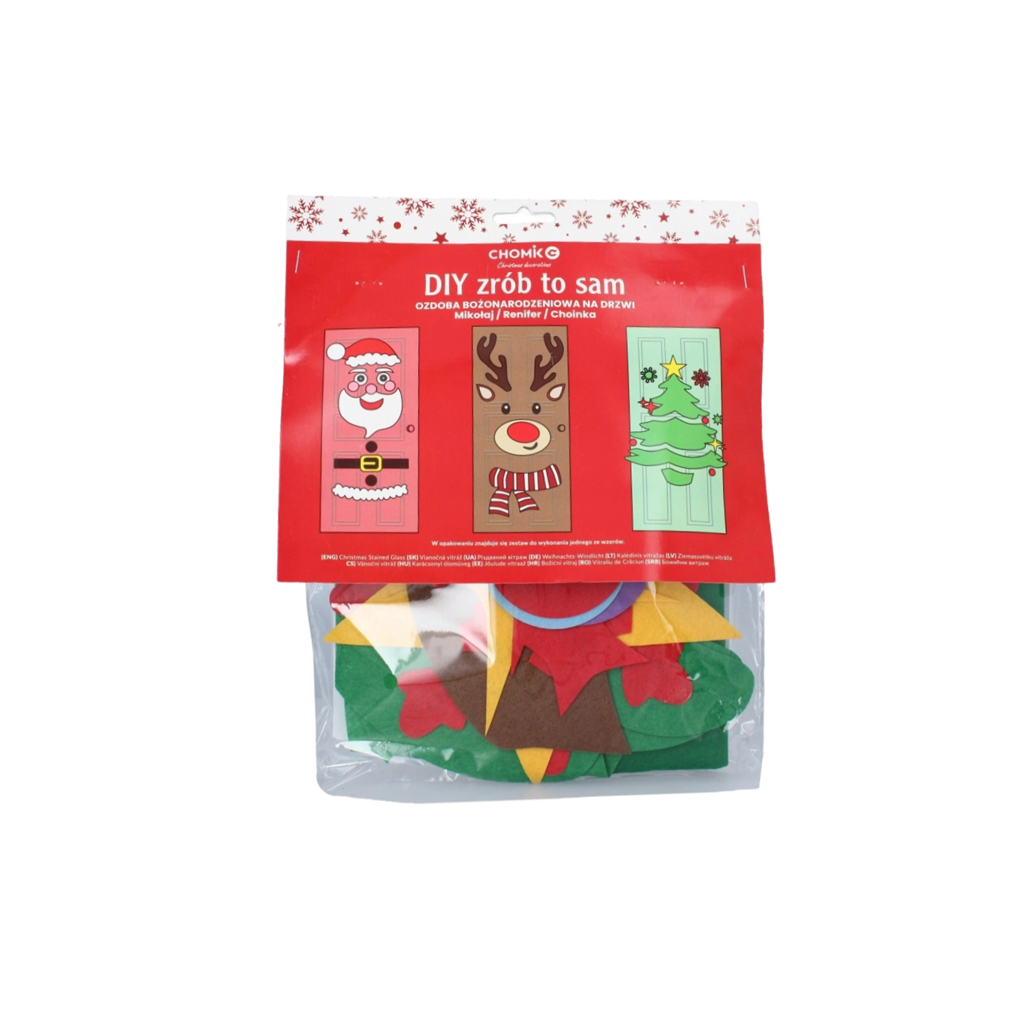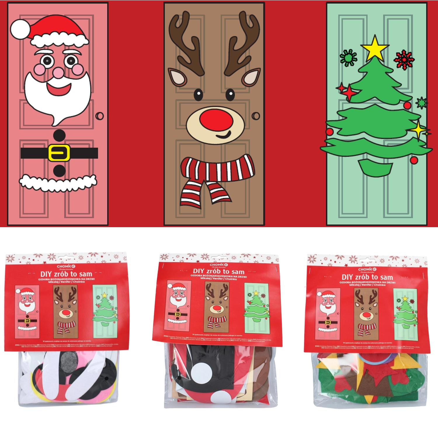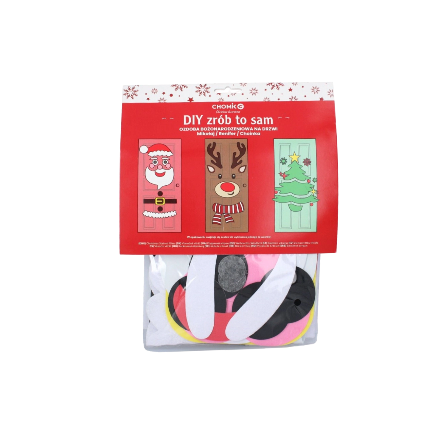 Ustvarite doma čarobno vzdušje s kreativnim kompletom DIY božičnih okraskov za vrata. Izberite motiv filcane smrečice, Božička ali jelena in uživajte v preprosti namestitvi, večkrat uporabnih delih ter zabavi za vso družino brez poškodovanja površin.