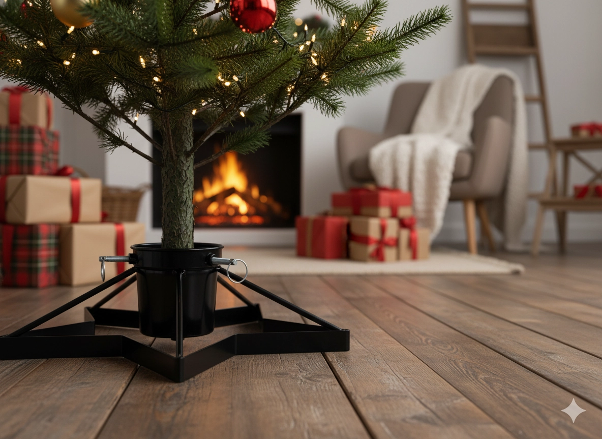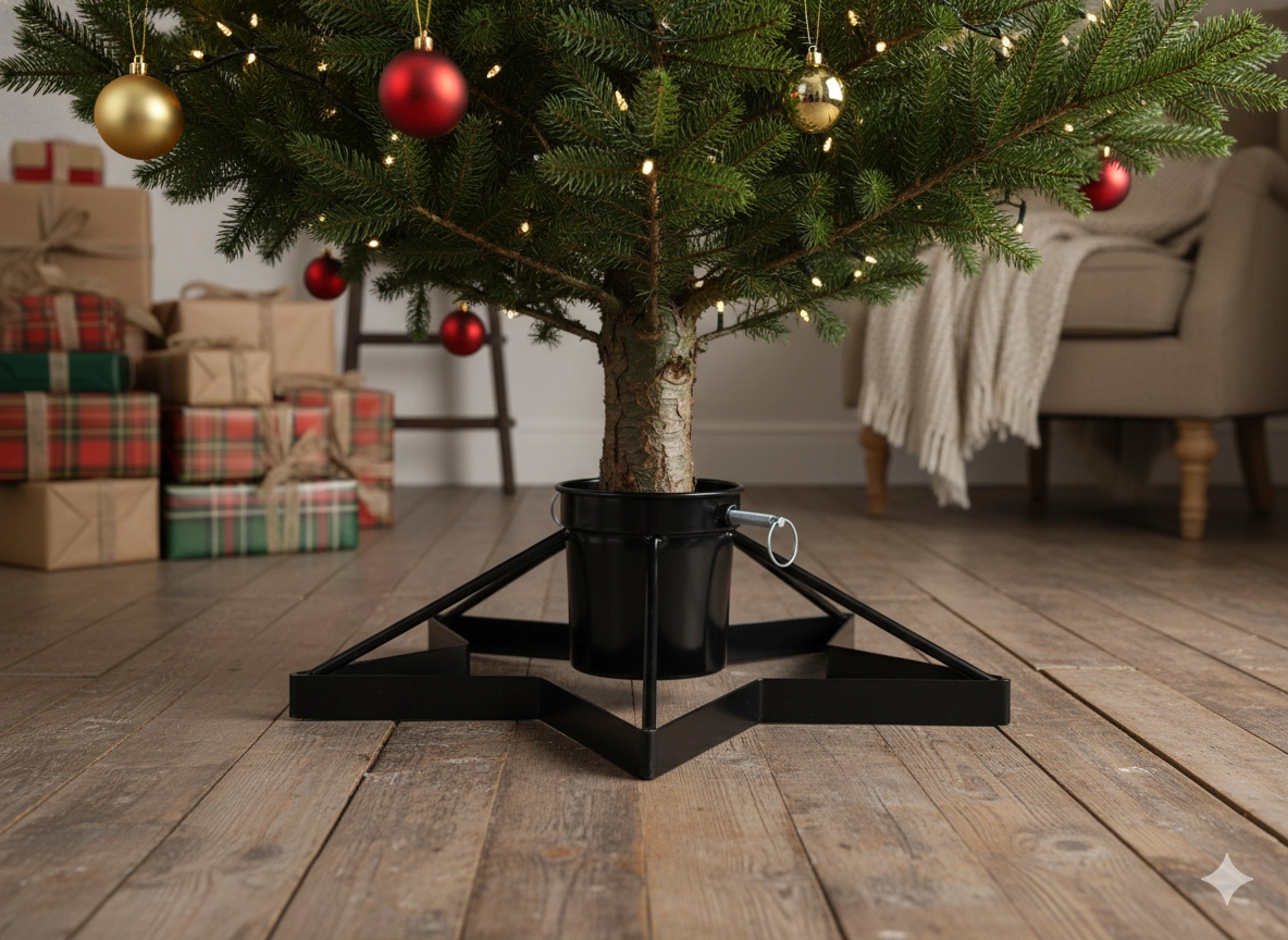 Drevo varno pritrdite s pomočjo nastavljivih vijakov, ki se prilagodijo premeru debla približno 35–120 mm. Integriran rezervoar za vodo (pribl. 1 l) olajša vzdrževanje in zmanjšuje odpadanje iglic. Minimalistična črna izvedba deluje elegantno in brezčasno.