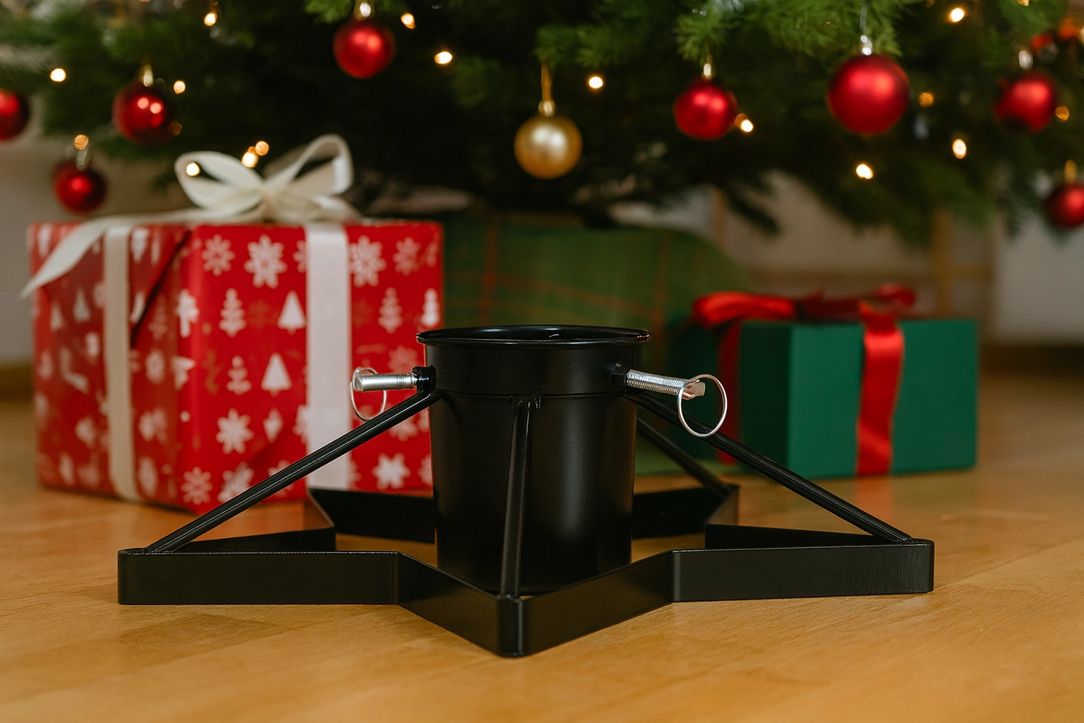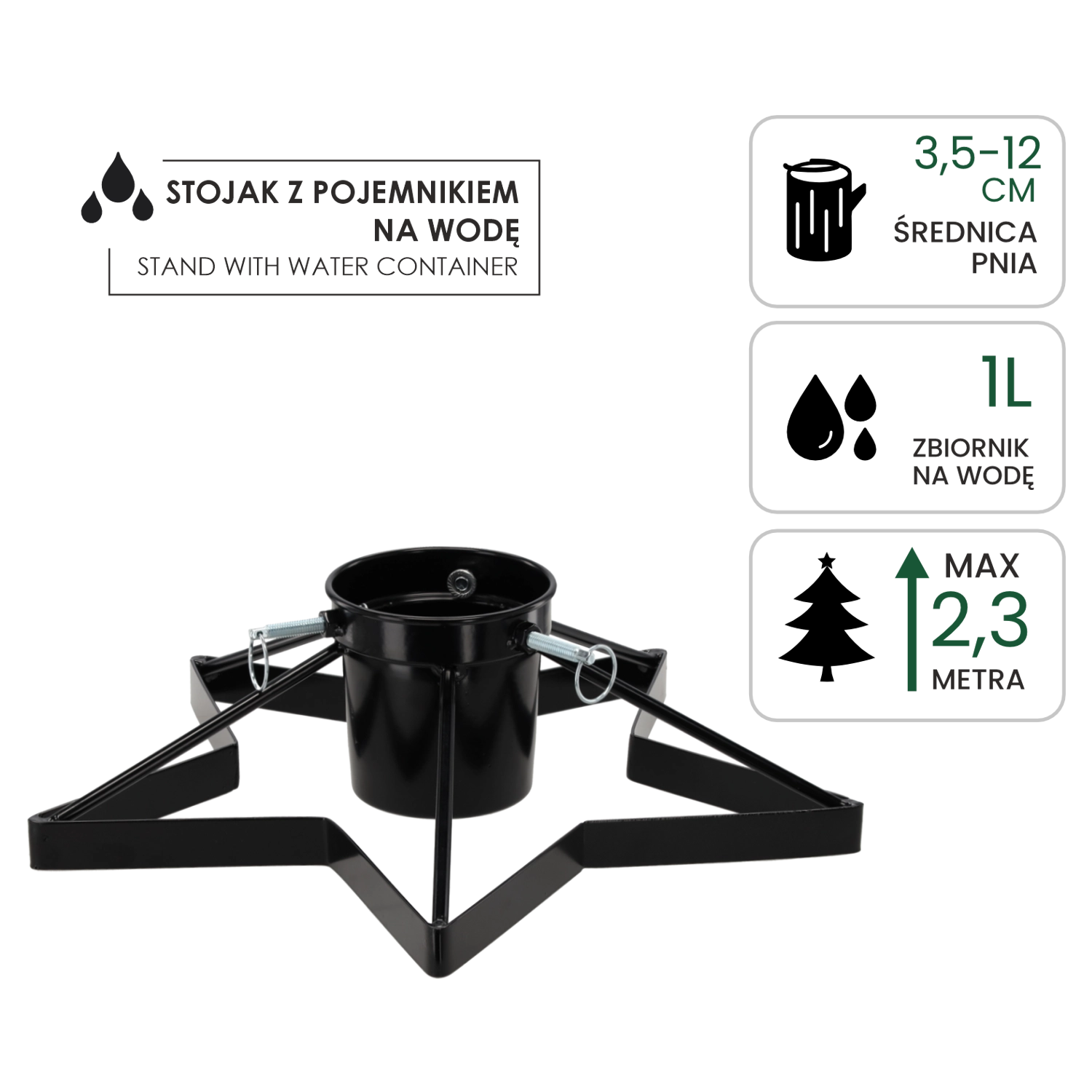 Elegantno in stabilno kovinsko stojalo za božično drevo z integriranim rezervoarjem za vodo ohranja vaše drevo dlje časa sveže in varno na mestu. Zahvaljujoč robustni kovinski konstrukciji, široki zvezdasti osnovi in trem vpenjalnim vijakom je montaža enostavna, drevo pa stoji popolnoma stabilno brez majanja. Črna izvedba se poda v vsak interier, od klasike do modernega lofta.