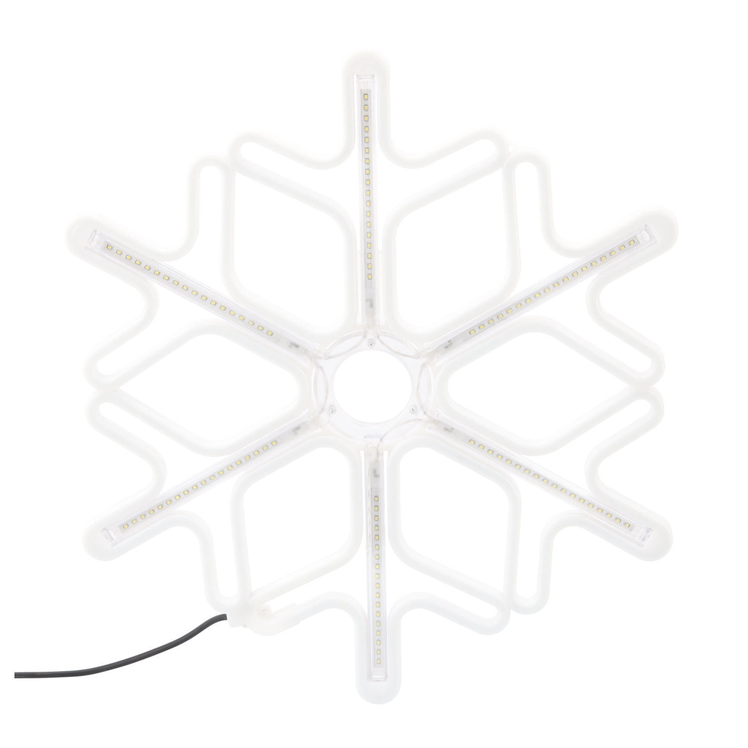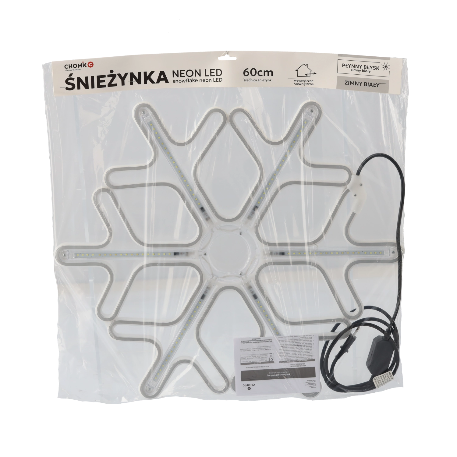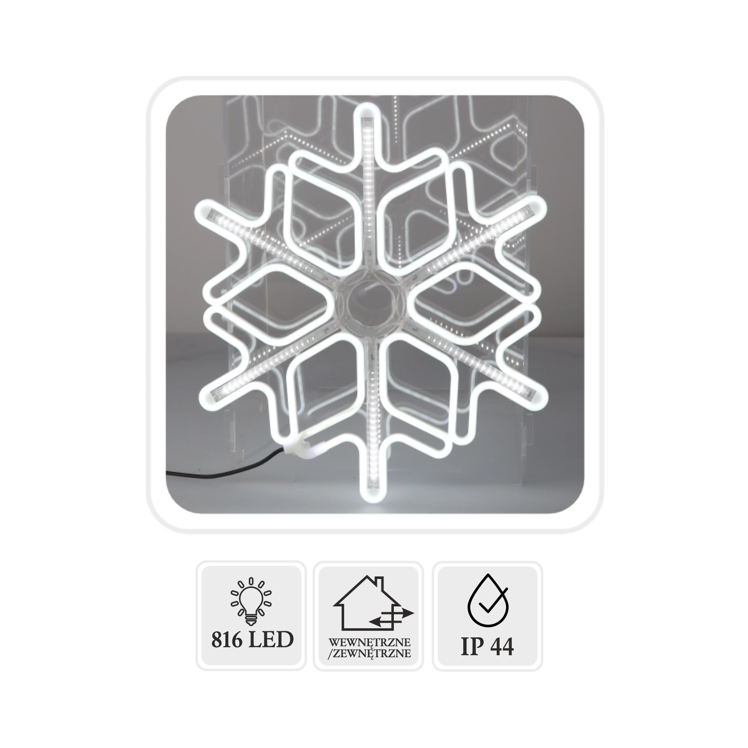 Stilna neonska snežinka premera 60 cm osvetli dom in fasado. Zahvaljujoč 816 LED v hladno beli z efektom bliska ustvari intenziven zimski sij. Odpornost IP44 omogoča varno uporabo v notranjih prostorih in na prostem, dvostranska neonska cev pa poskrbi za enakomerno svetlobo in moderen videz.