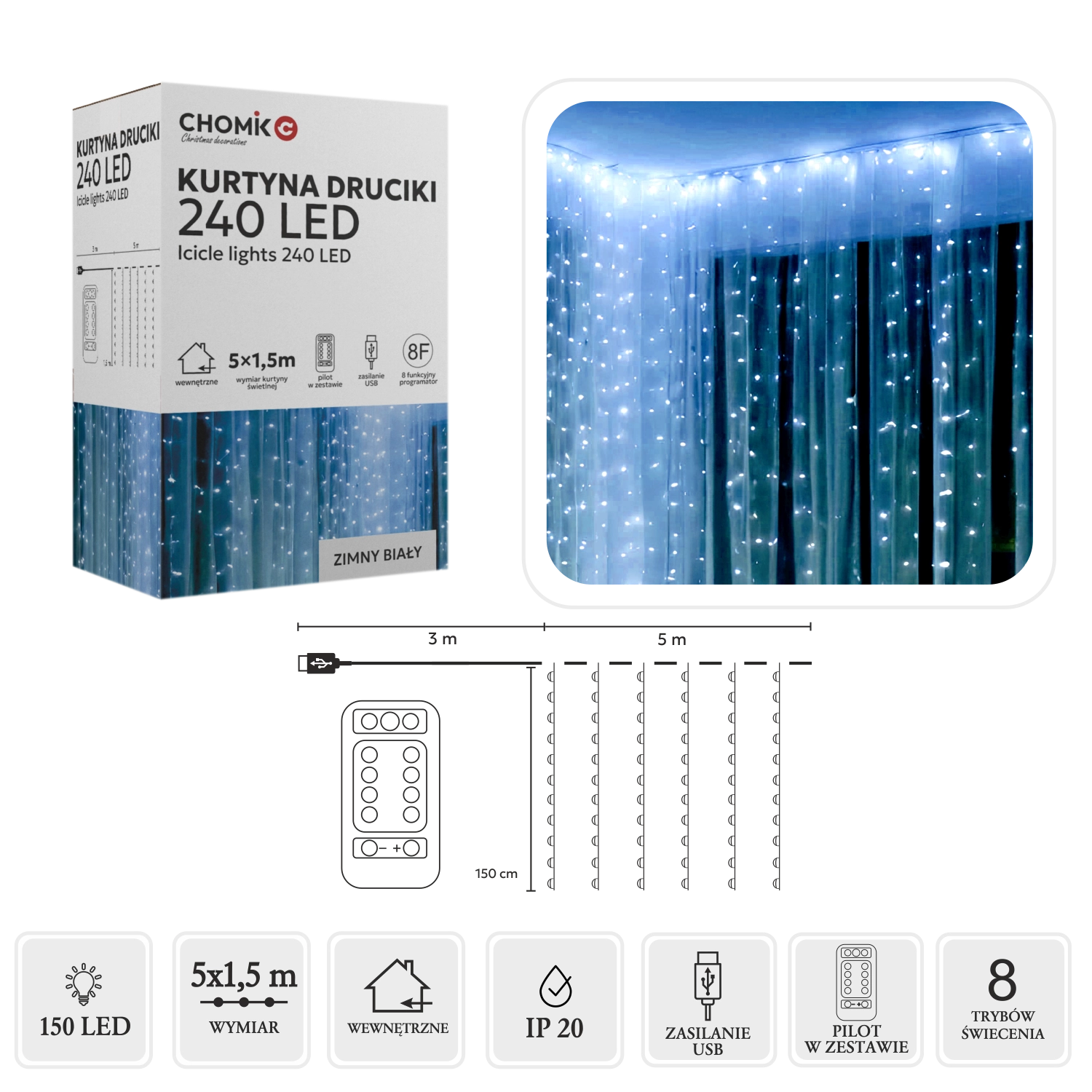 Elegantna svetlobna zavesa z mikro LED v barvi hladno bela ustvari leden sijaj na oknih, stenah in balkonih. Ponuja 240 LED na površini 5 × 1,5 m, priročno USB napajanje in daljinsko upravljanje z 8 svetlobnimi programi. Zahvaljujoč zaščiti IP44 je primerna za notranjo in zunanjo uporabo, srebren vodnik doda dekoraciji nežnost in eleganco.