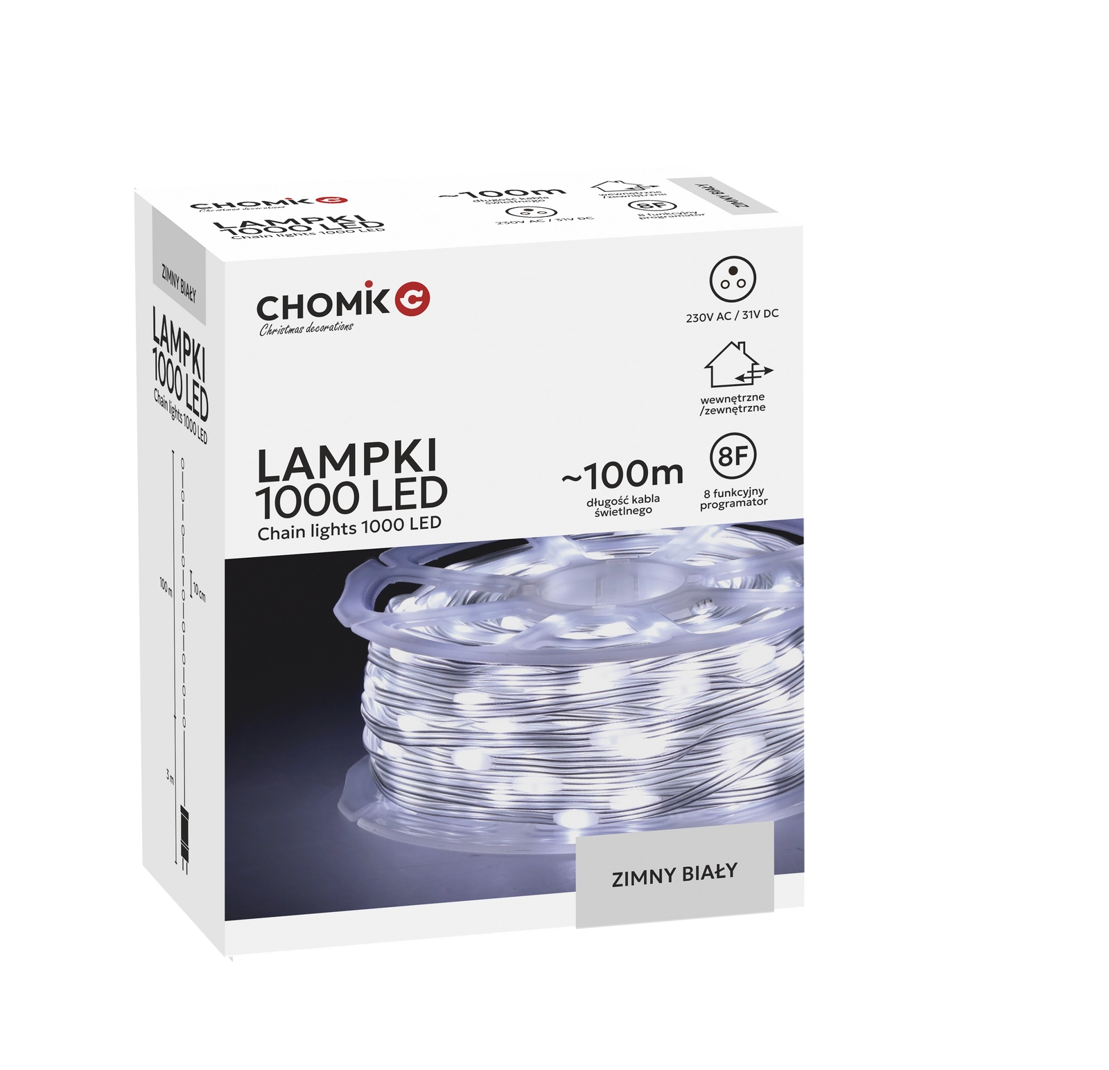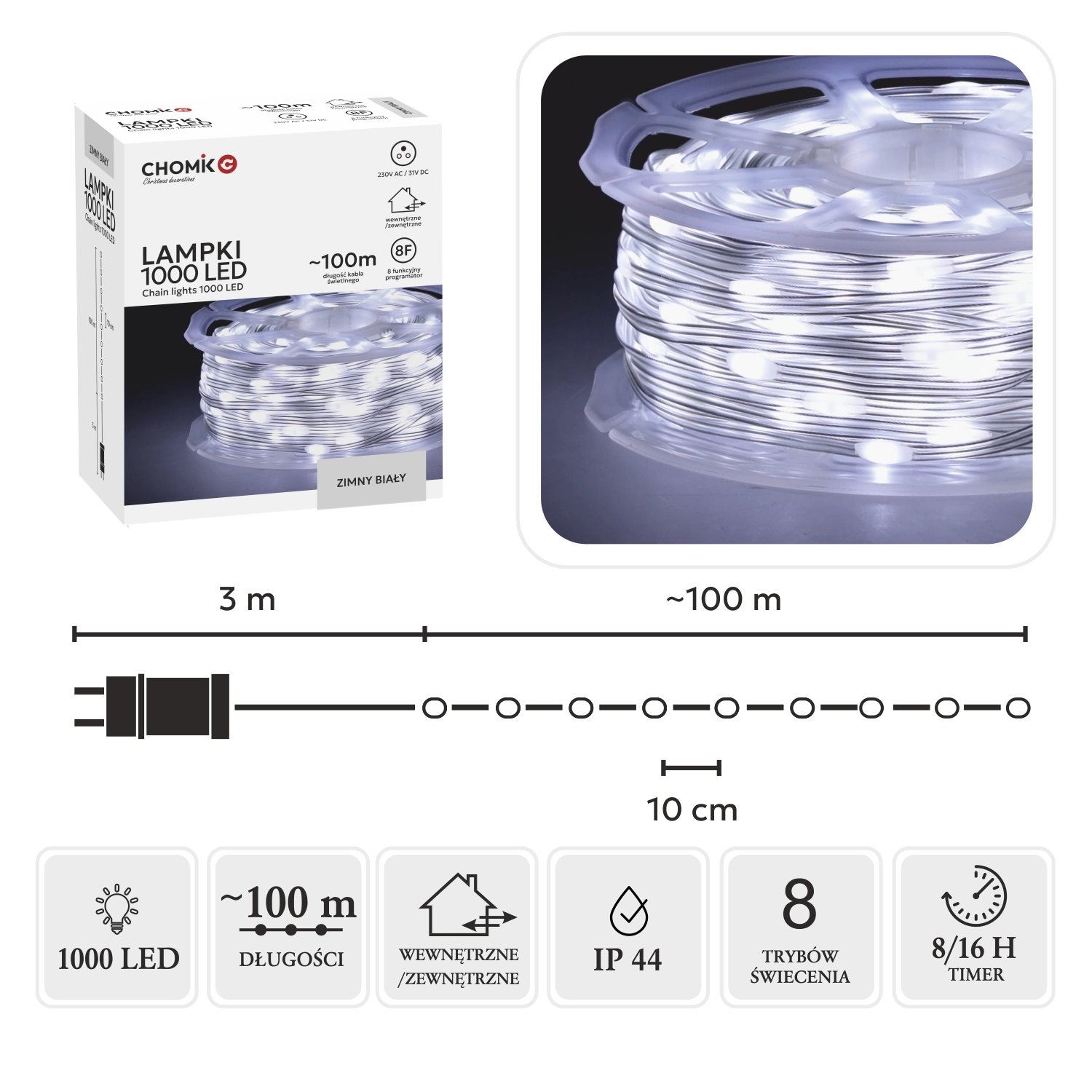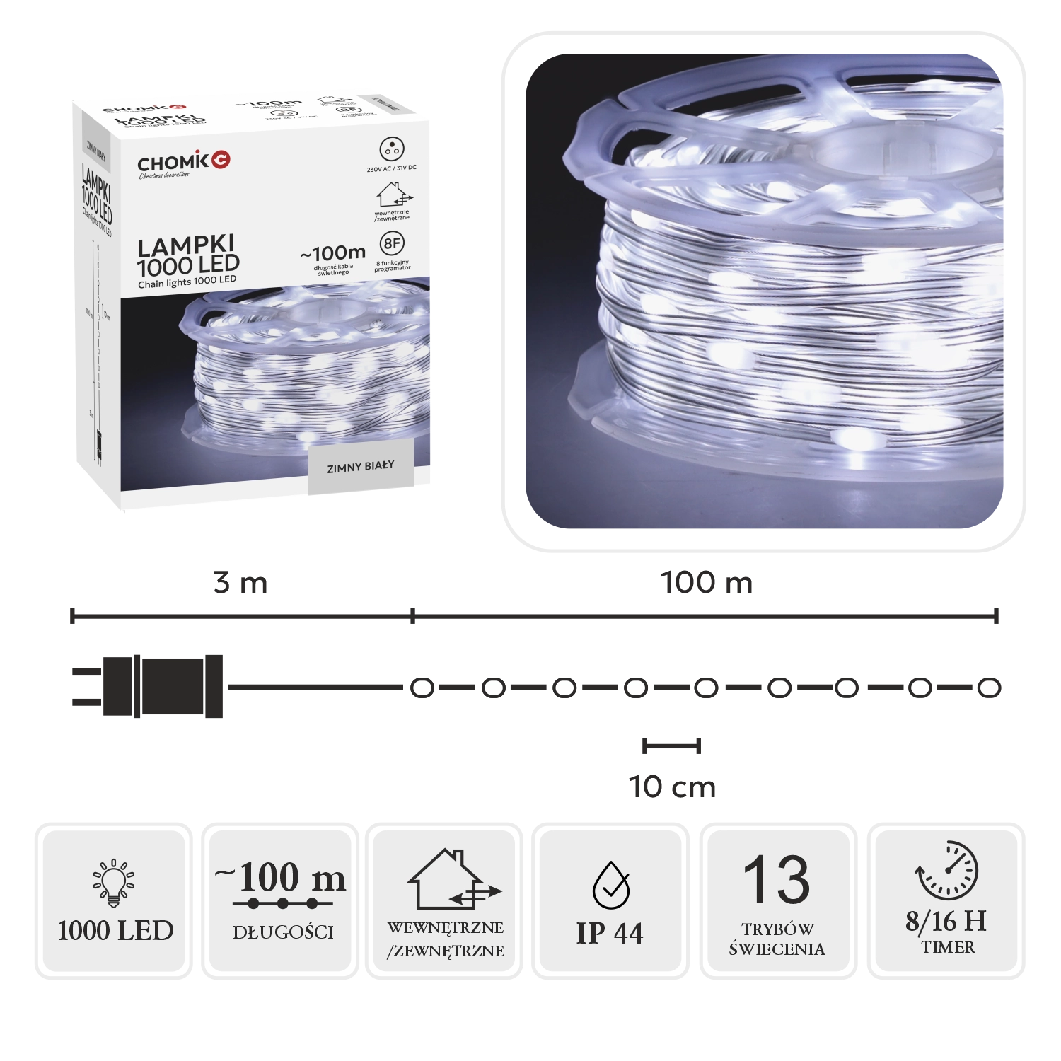 Profesionalna svetlobna veriga s 1000 mikro LED v hladno beli barvi za velike dekoracije in zunanje površine. 100 m svetlečega dela in prosojen kabel ustvarjata eleganten zvezdnat učinek. Udobno upravljanje omogoča programator z 8 načini, pomnilnikom in časovnikom 8/16 h. Za varno zunanjo uporabo s IP44 zaščito.