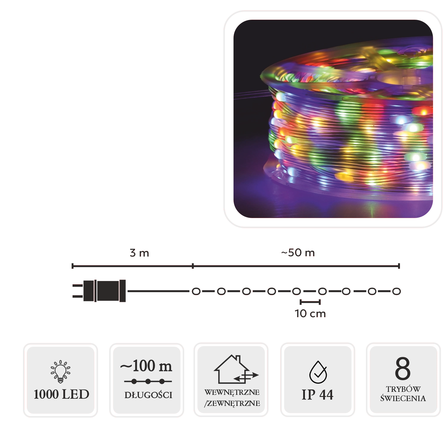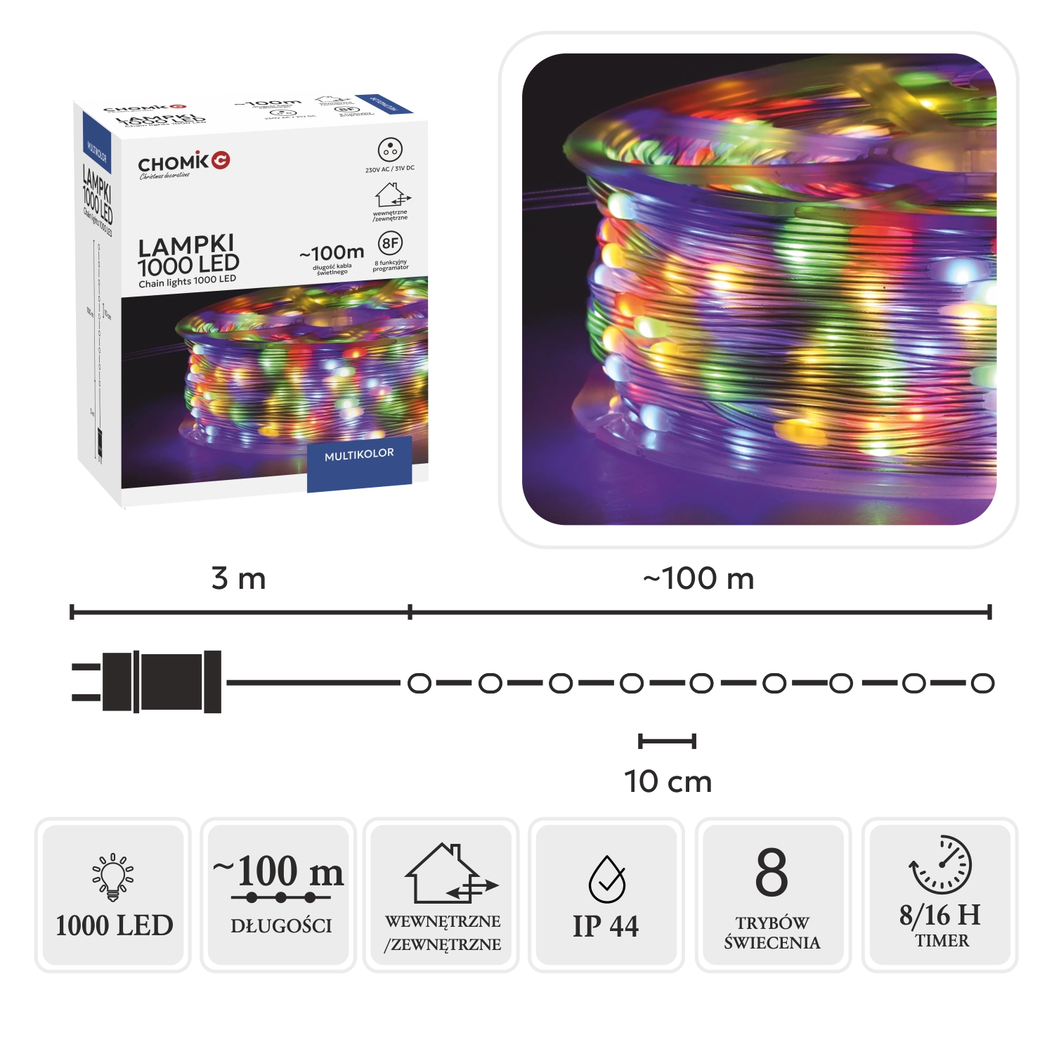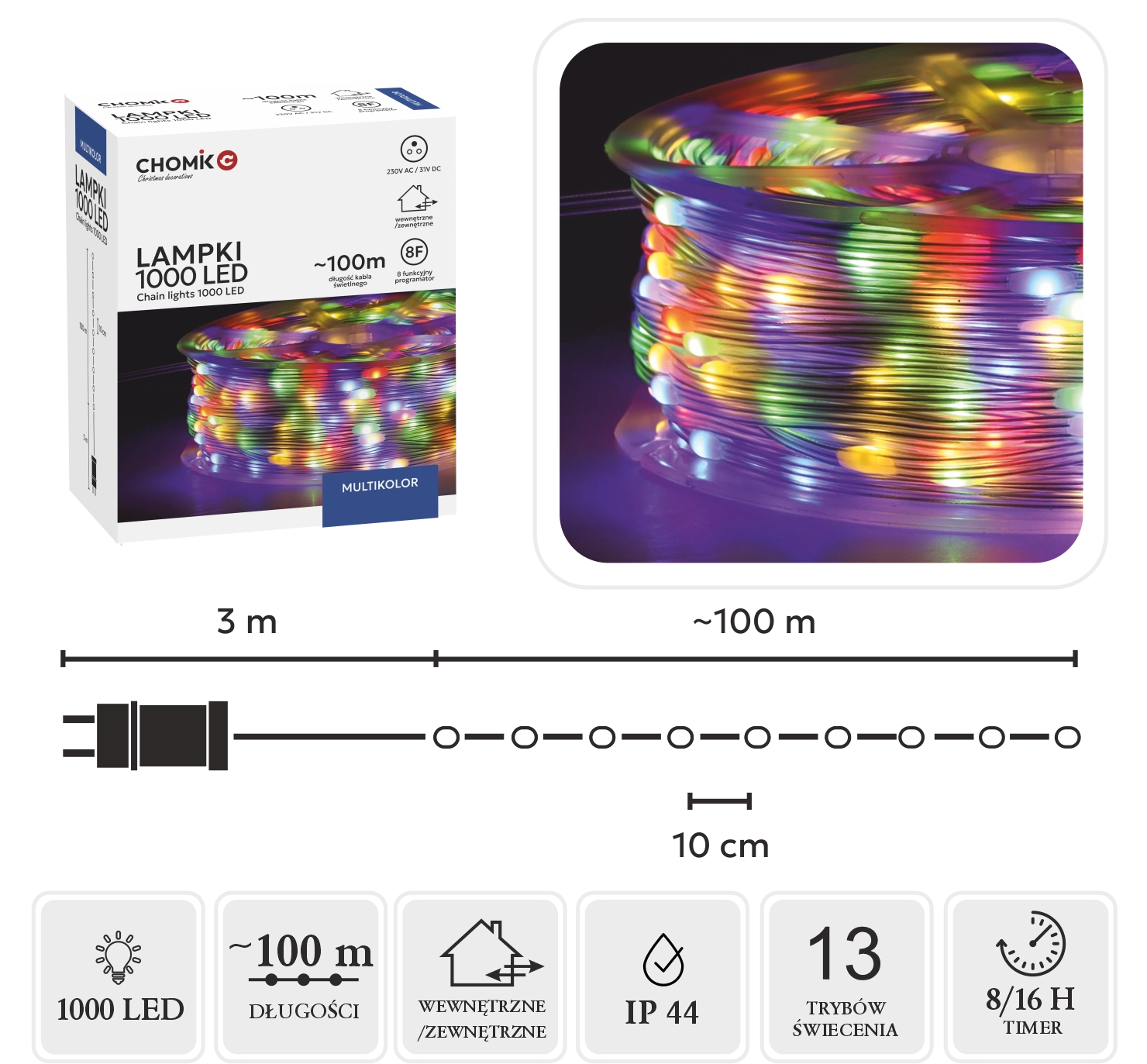Praktični upravljalnik z 8 funkcijami ima spomin zadnje nastavitve in časovnik 8/16 h za samodejni vklop in izklop. Kolut v paketu olajša rokovanje, shranjevanje in večkratno uporabo. Zahvaljujoč zaščiti IP44 je veriga primerna za notranje prostore in zaščitene zunanje površine.