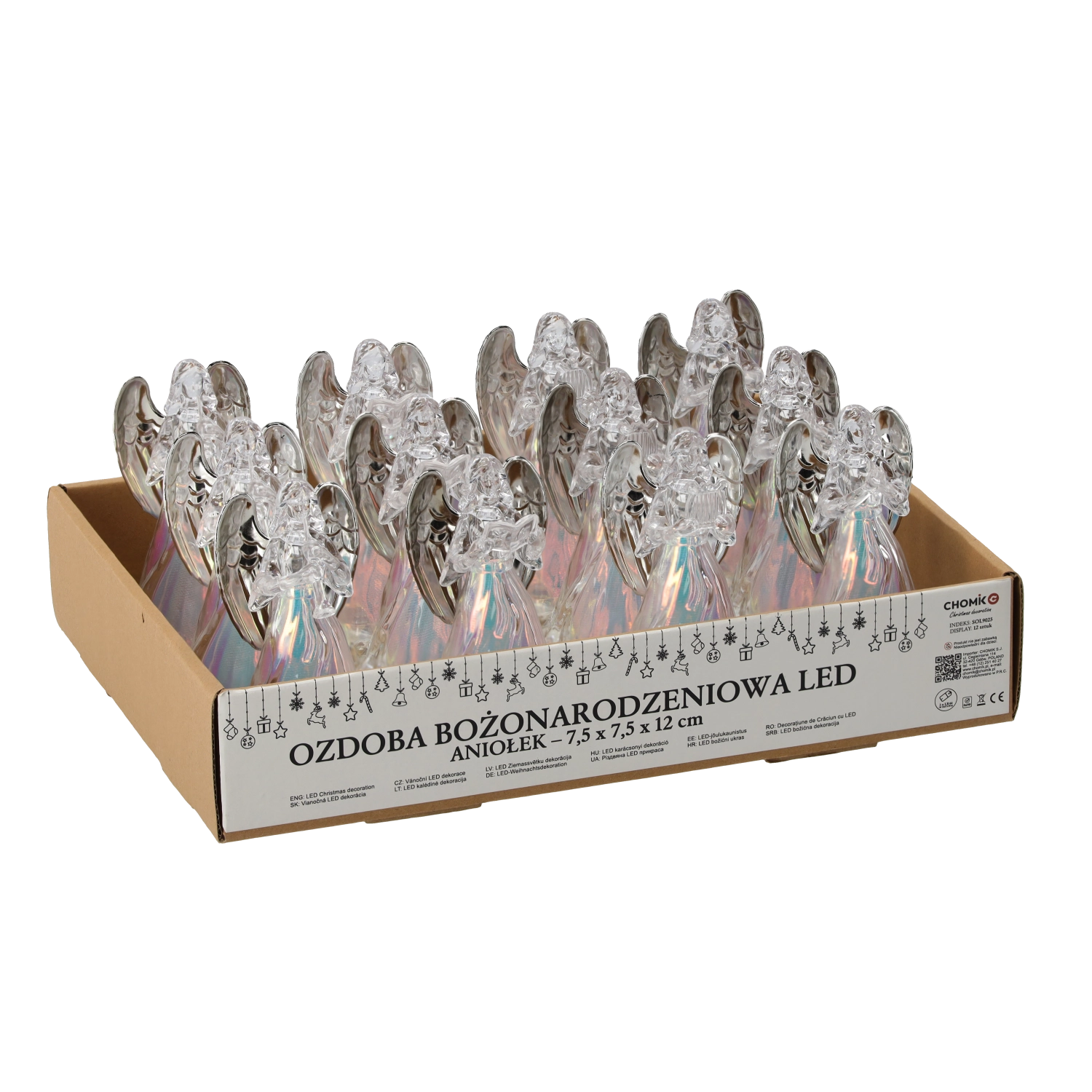 Zahvaljujoč kompaktnim meram 7,5 × 12,5 cm je angel primeren za praznično mizo, polico ali otroško sobo. Osvetlitev, napajana s 3 baterijami LR44 (v pakiranju), omogoča takojšnjo uporabo brez kablov. Model je na voljo v različnih izvedbah, ki se razlikujejo po drobnih predmetih v angelovih rokah.