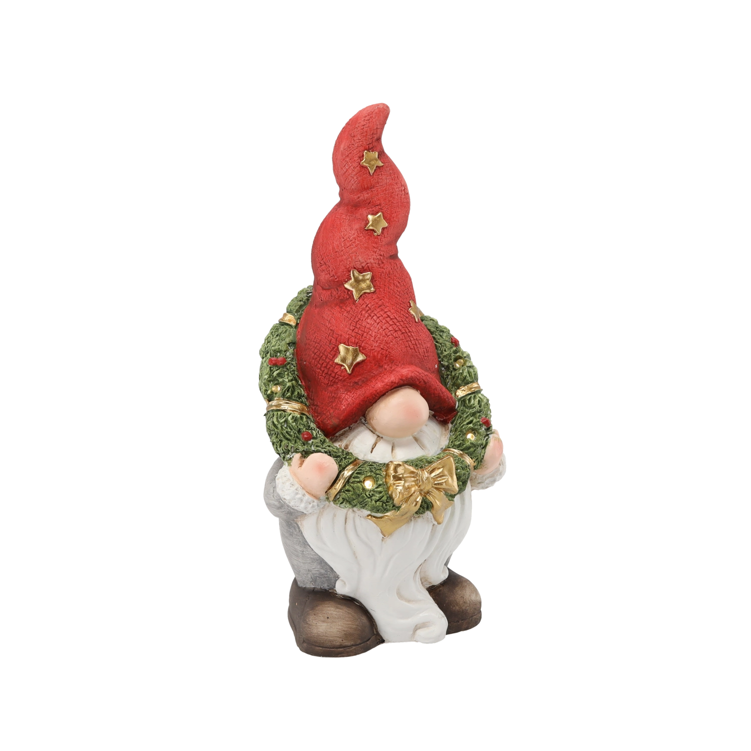 Ta podrobno izdelana božična figurica škrata z vencem bo vašemu domu dodala prijetno praznično vzdušje. Vgrajena LED osvetlitev nežno osvetli dekor in ustvari topel učinek v dnevni sobi, predsobi ali otroški sobi. Zahvaljujoč magnezijevi masi je figurica stabilna, odporna in primerna za dolgotrajno uporabo.