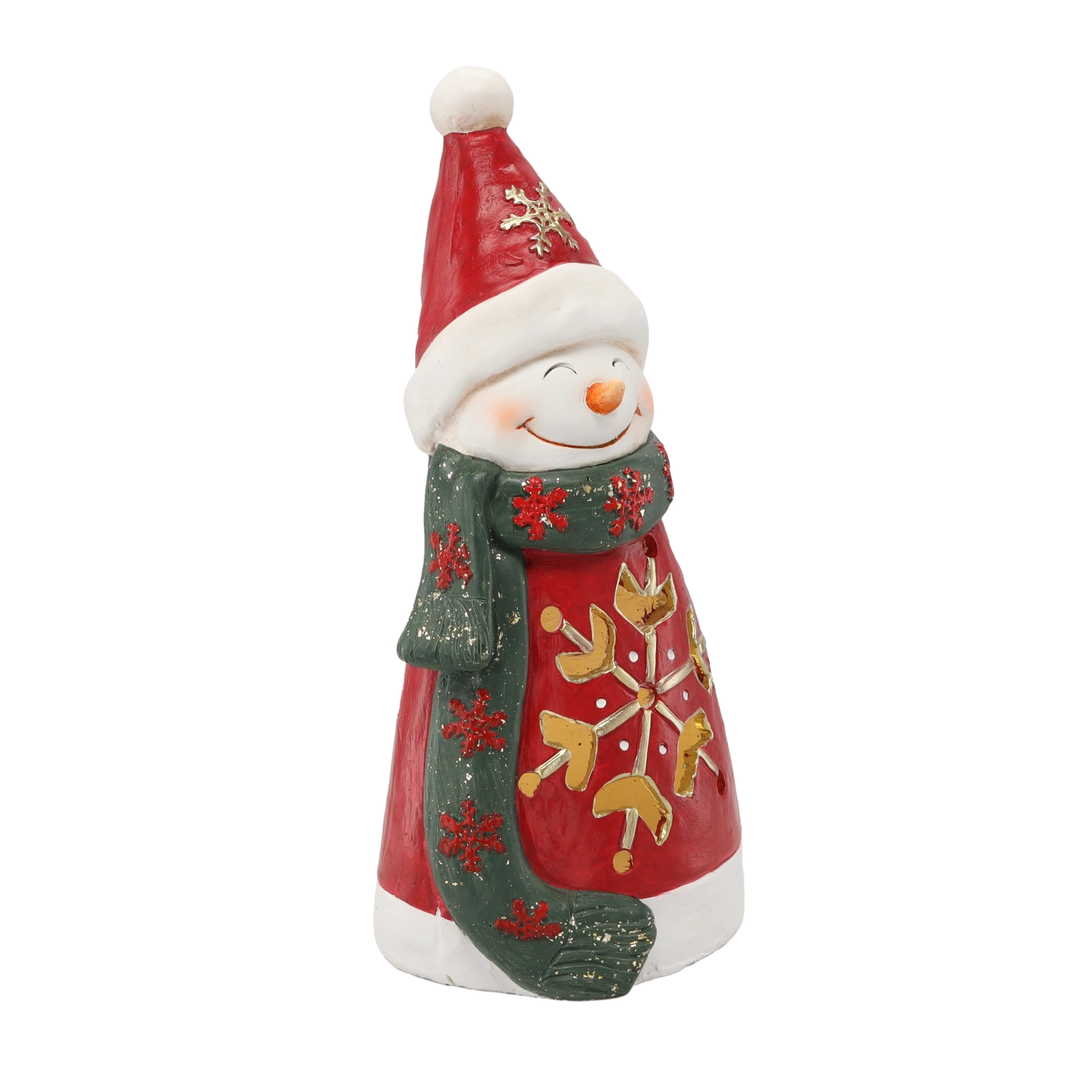 Ta stilski snežak v rdečem plašču in kapi, z zelenim šalom in okrasno snežinko, bo v prostor vnesel praznično čarobnost. Vgrajena LED luč nežno osvetljuje dekor in tako ustvarja prijetno, toplo vzdušje.