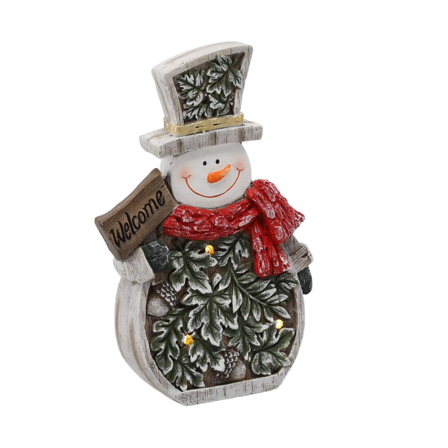 Ta stilska božična figurica snežaka z okrasnimi listi v vsak interier vnese toplino in domačnost. Vgrajena LED luč ustvari nežno osvetlitev, ki poudari detajle dekoracije in podčrta praznično vzdušje med dolgimi zimskimi večeri.