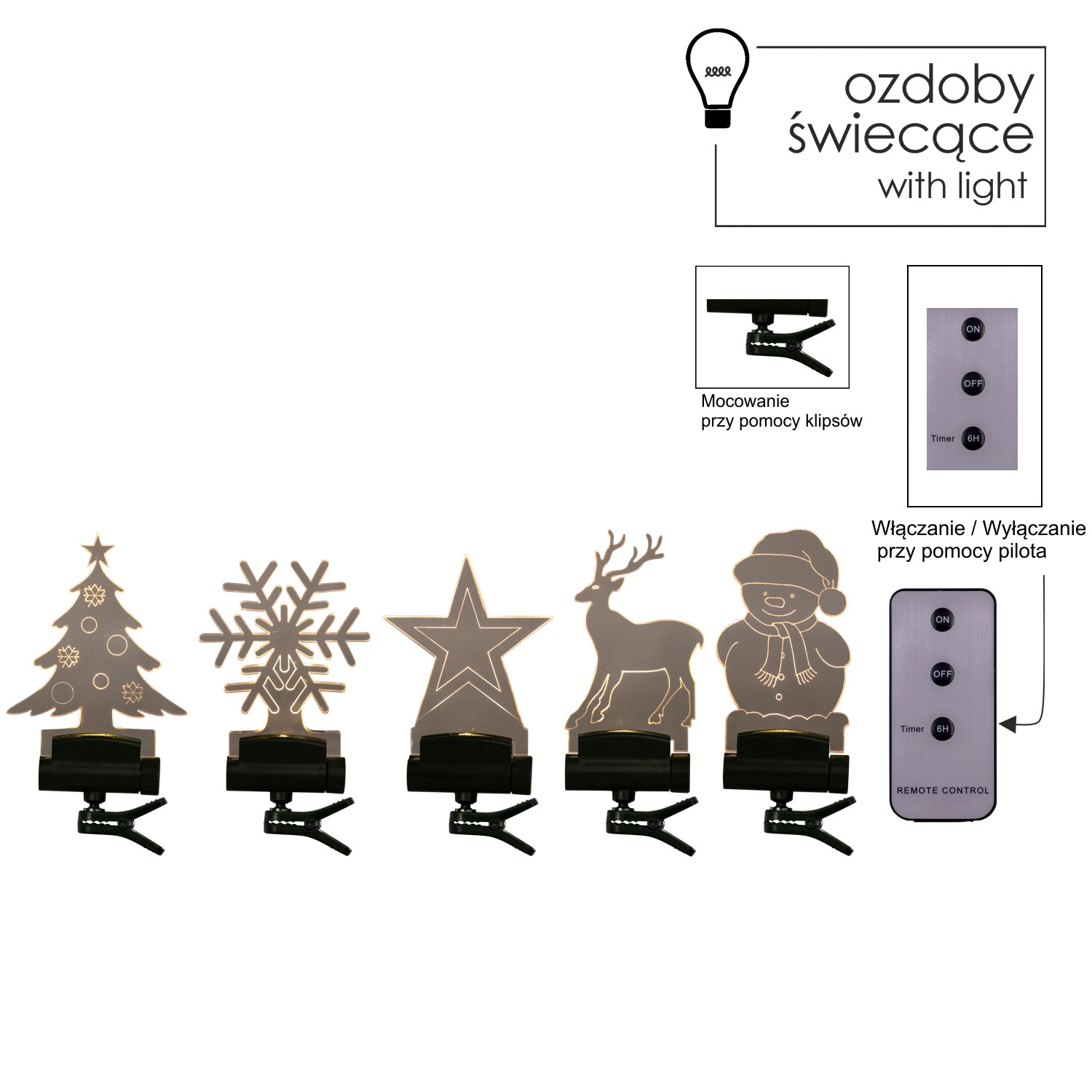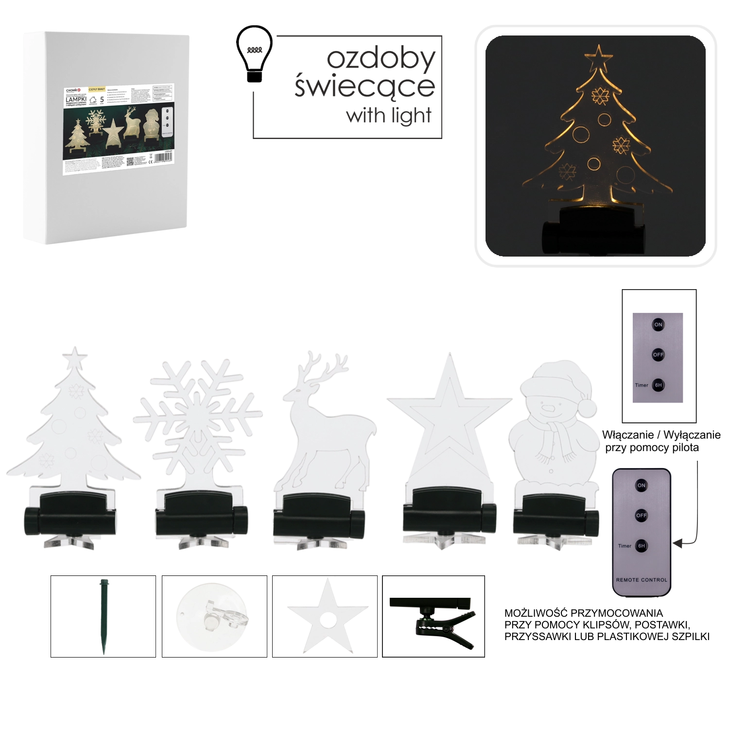 Vnesite v dom čarobno božično vzdušje s setom 5 akrilnih LED dekoracij v oblikah drevesca, snežinke, zvezde, severnega jelena in snežaka. Topla bela svetloba in različne možnosti pritrditve (prisesek, sponka, stojalo, paličica) omogočajo enostavno namestitev na okno, mizo, venec ali v cvetlični lonec. Uporabo poenostavi daljinski upravljalnik s časovnikom.
