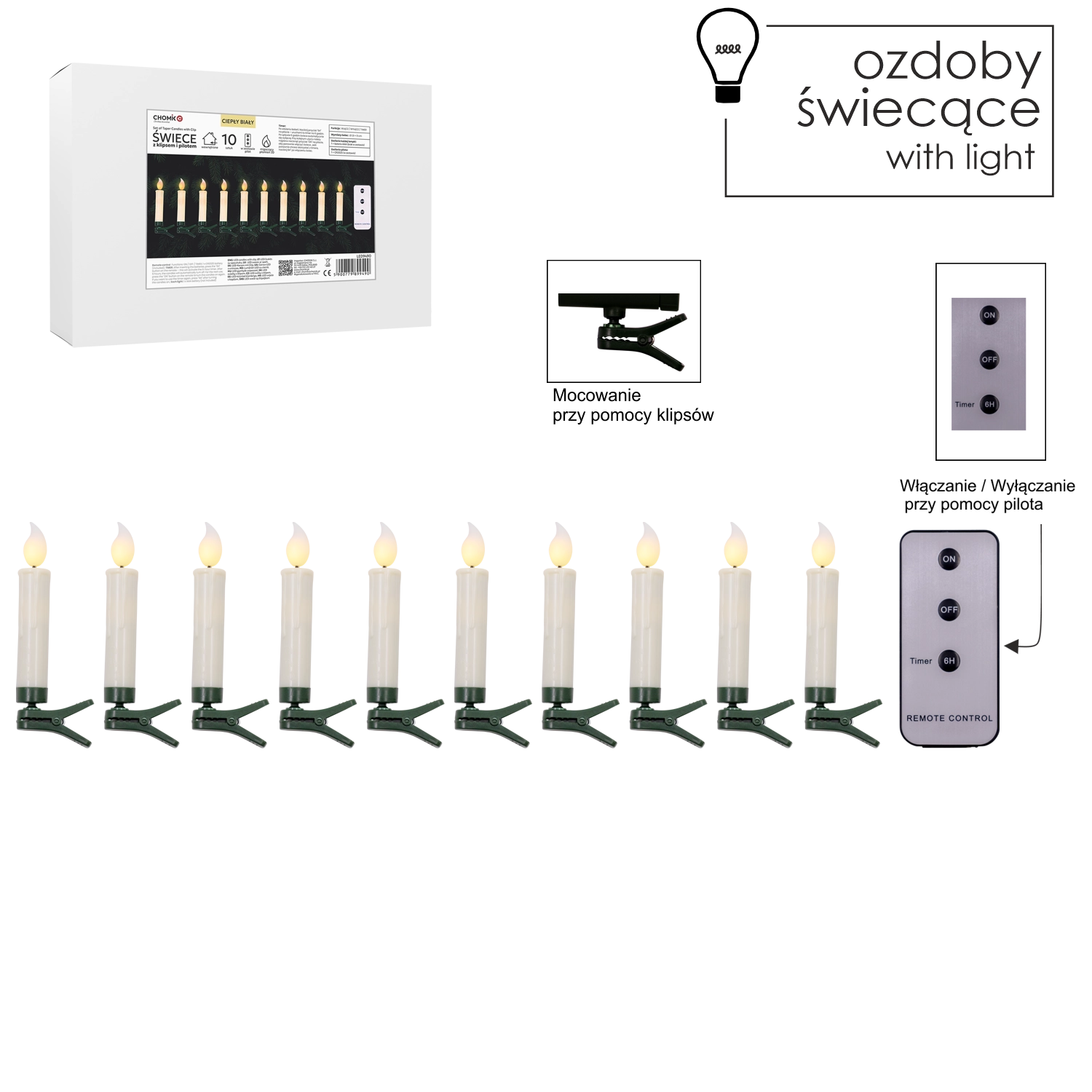 Elegantne LED svečke s sponko pritrdite v trenutku na vejice drevesca, venčke ali druge dekoracije. Zahvaljujoč realističnemu 3D plamenu delujejo kot prave sveče, vendar brez dima, segrevanja in tveganja požara. Za vse poskrbi daljinski upravljalnik s funkcijami vklopa, izklopa in časovnika – dovolj je pritisniti gumb in uživati v prijetni svetlobi.