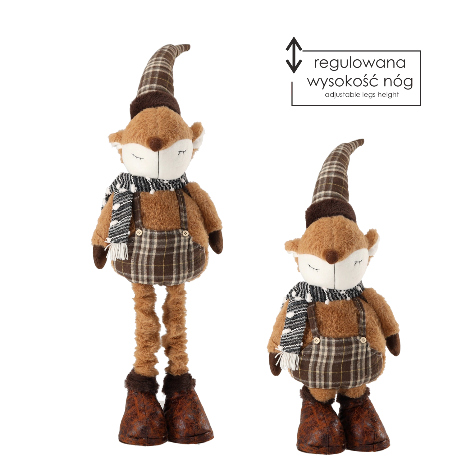 Noge s teleskopskim mehanizmom omogočajo hitro prilagajanje različnim mestom – od polic in komod do božičnih kotičkov v dnevni sobi. Tradicionalna barvna usklajenost in lisjaški šarm prostoru dodata domačnost in praznično čarobnost.