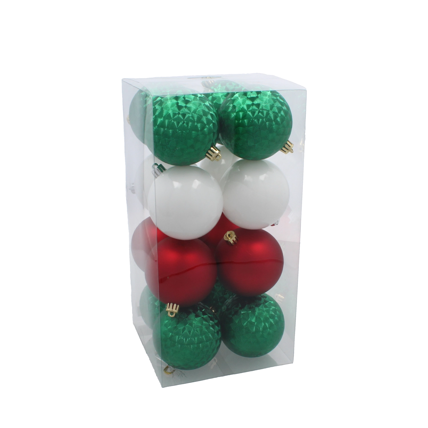 Stilni set 16 božičnih krogel s premerom 8 cm v rdeči, zeleni in beli barvi vašemu drevesu doda tradicionalen in eleganten videz. Kombinacija mat in sijajnih površin ustvari čudovit lesk v svetlobi. Trpežen plastičen material je varen za otroke in hišne ljubljenčke ter zagotavlja dolgo življenjsko dobo. Priloženo je praktično pakiranje za enostavno shranjevanje.